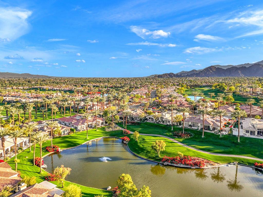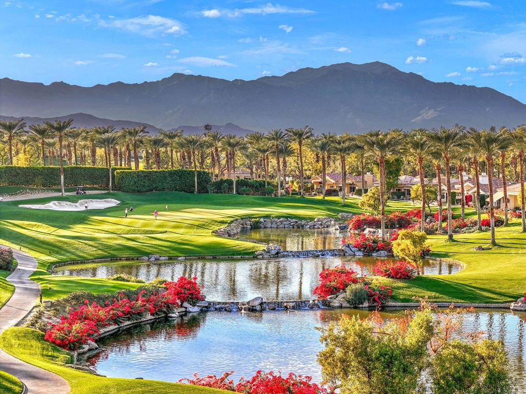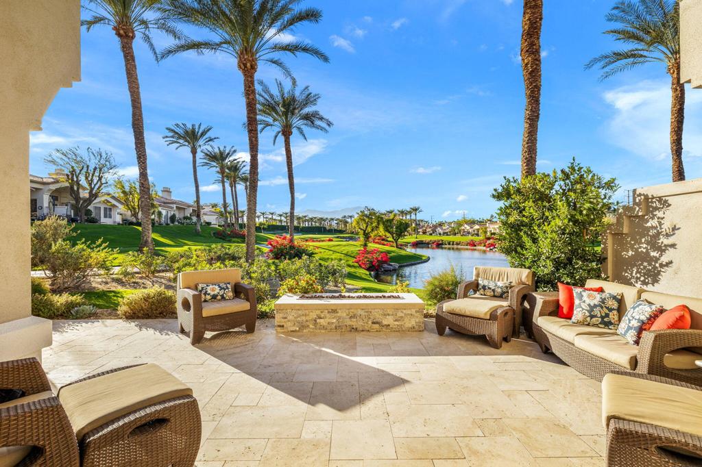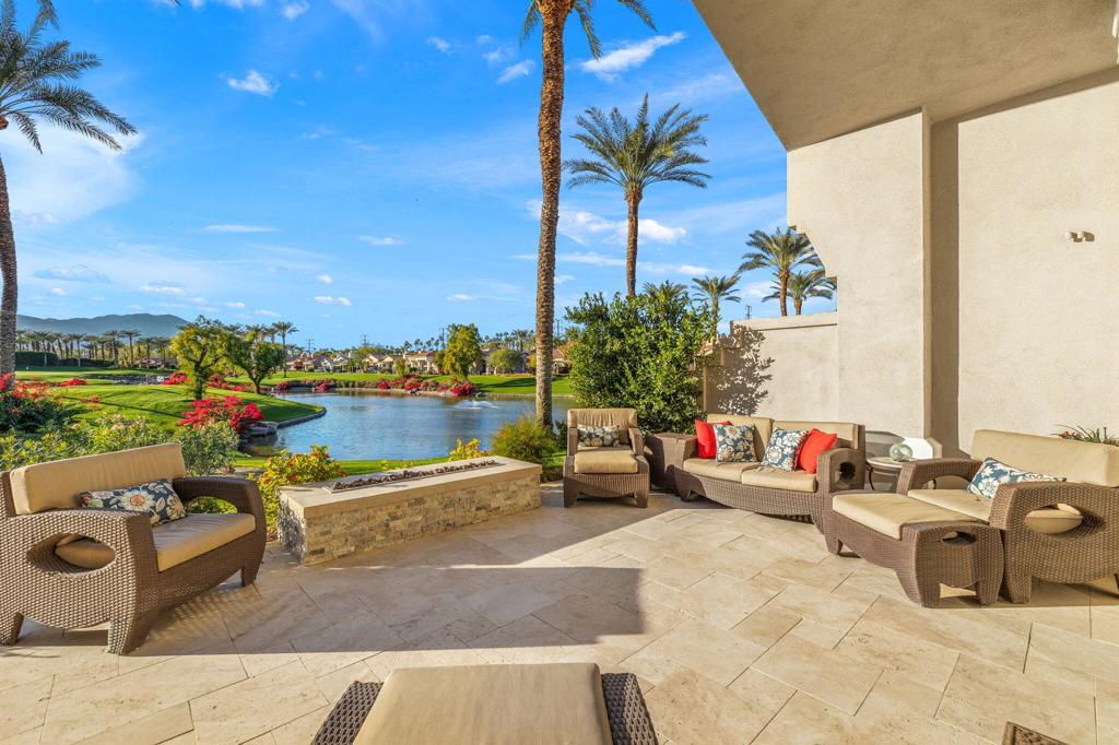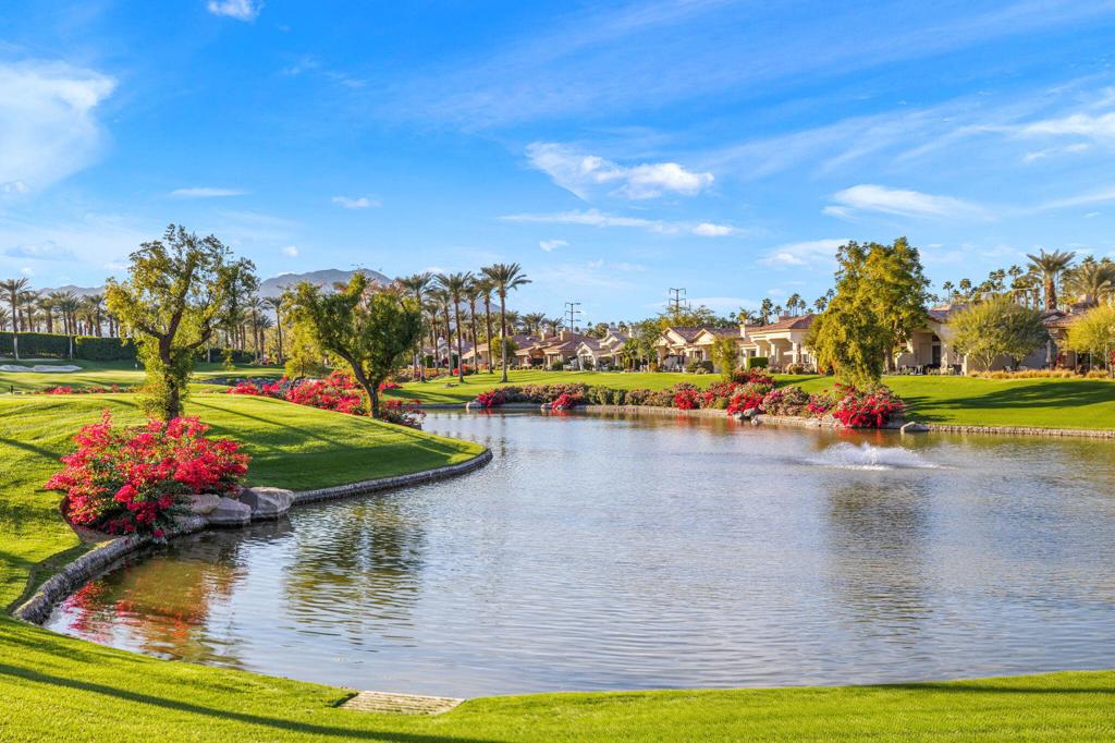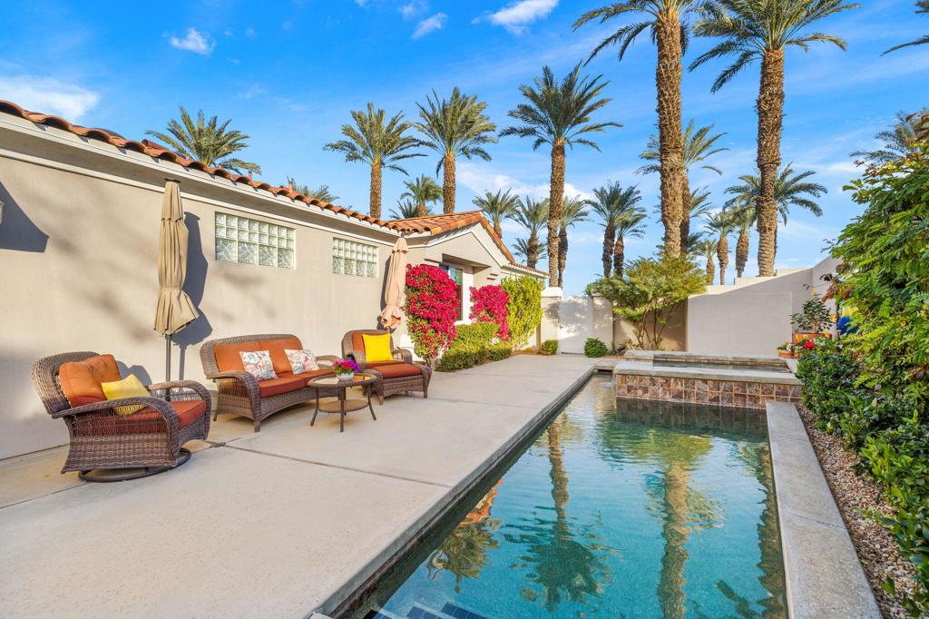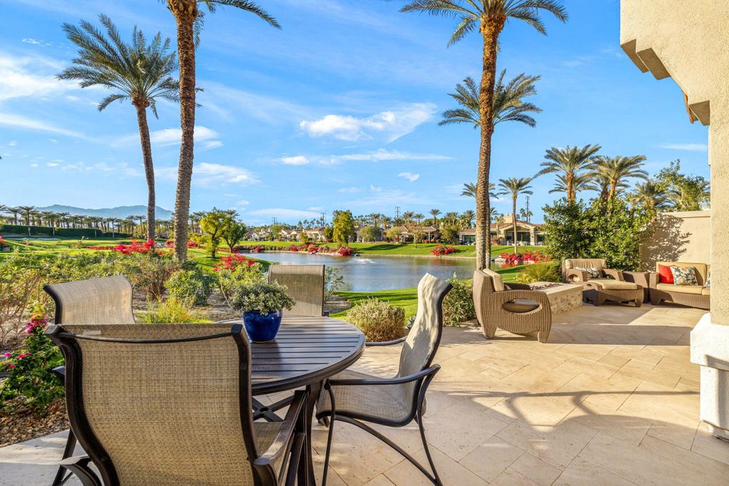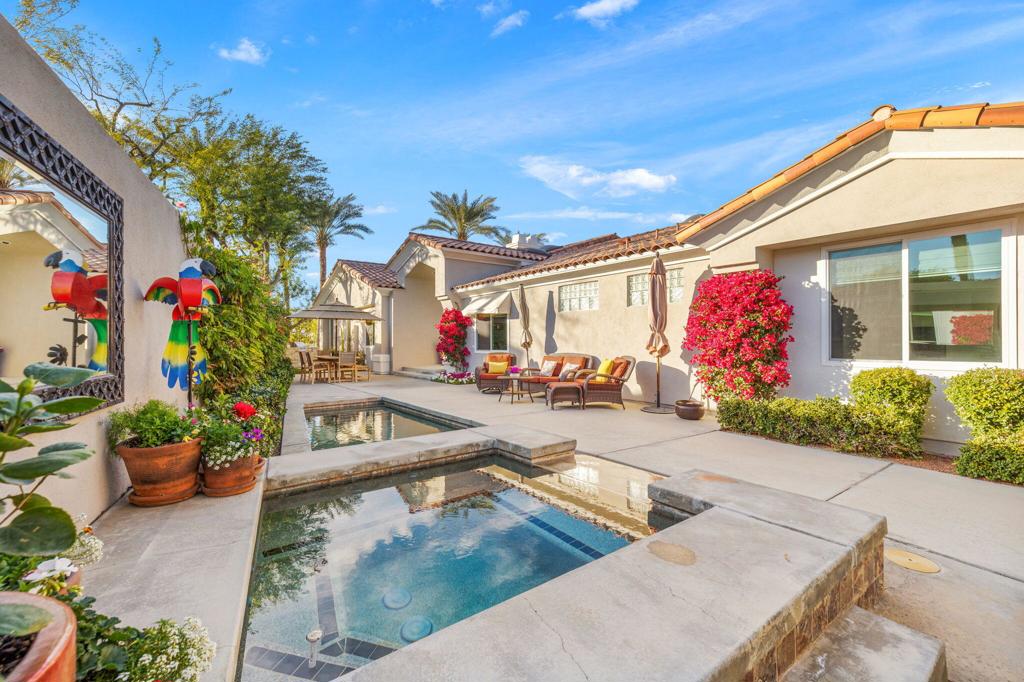 Welcome to the rare and stunning Acacia 5 home, a Palm Desert oasis featuring its own pool and spa in the beautiful flora and fauna of the private courtyard. Nestled in Indian Ridge Country Club, this home offers breathtaking panoramic views of serene lakes, cascading waterfalls, majestic mountains, and the signature 8th fairway of the Grove Golf Course. The newly expanded Travertine patio is an entertainer's dream, complete with a built-in BBQ island, ample seating, a cozy fire pit, and the perfect ambiance for enjoying spectacular desert sunsets with your favorite drink in hand. Inside, the spacious kitchen shines with newer stainless-steel appliances, a chic tile backsplash, peninsula bar seating, and a convenient desk area for organizing recipes or planning your next gathering. Luxurious new wood plank flooring and fresh carpeting in the bedrooms add a modern touch of elegance throughout the home. The primary suite features a charming outdoor seating area, perfect for savoring your morning coffee or unwinding with a good book. En-suite guest bedrooms ensure comfort and privacy for visiting family and friends. Doors and windows have been replaced and there is nothing left for you to do except bring your toothbrush. With views this extraordinary, you'll never want to leave. Offered furnished per inventory, with a Club Membership available with no wait. This is a rare opportunity to embrace the ultimate desert lifestyle--don't miss it!