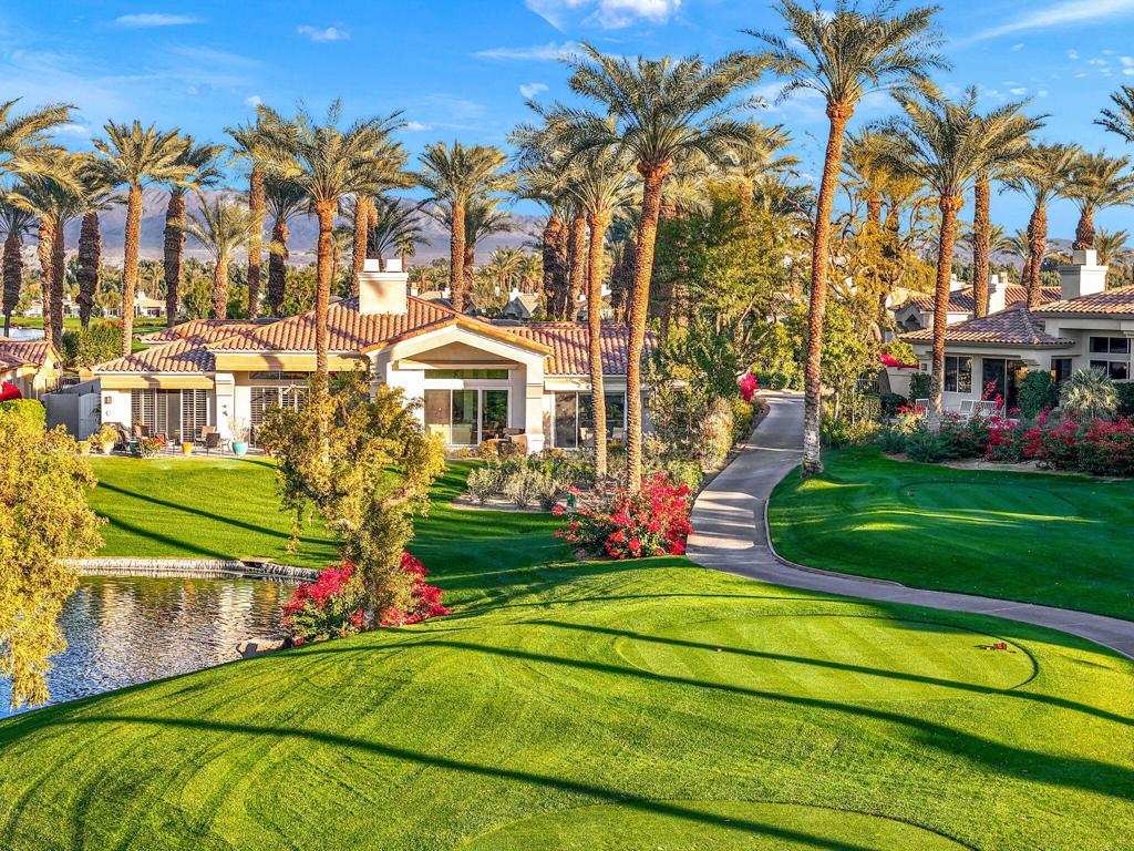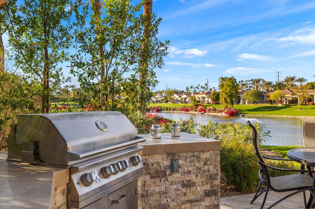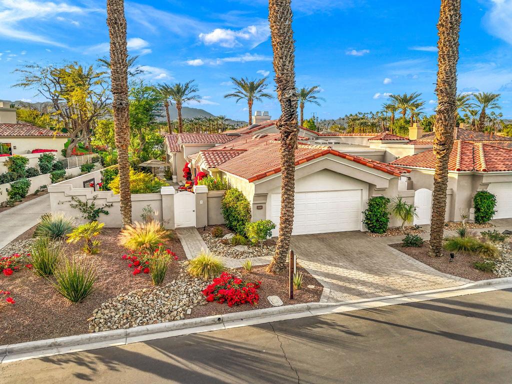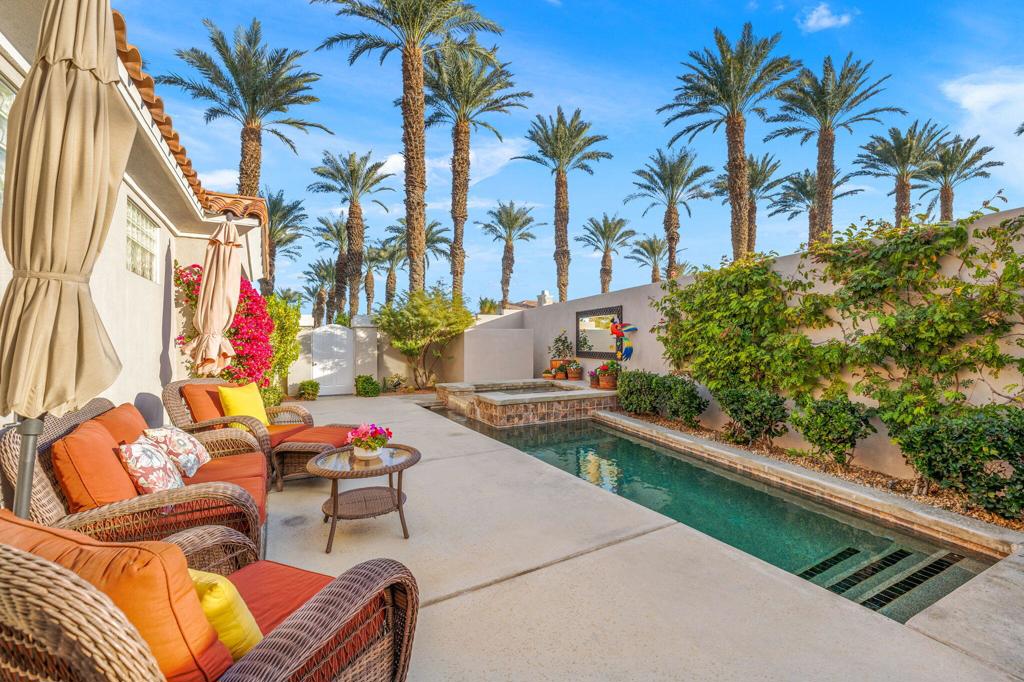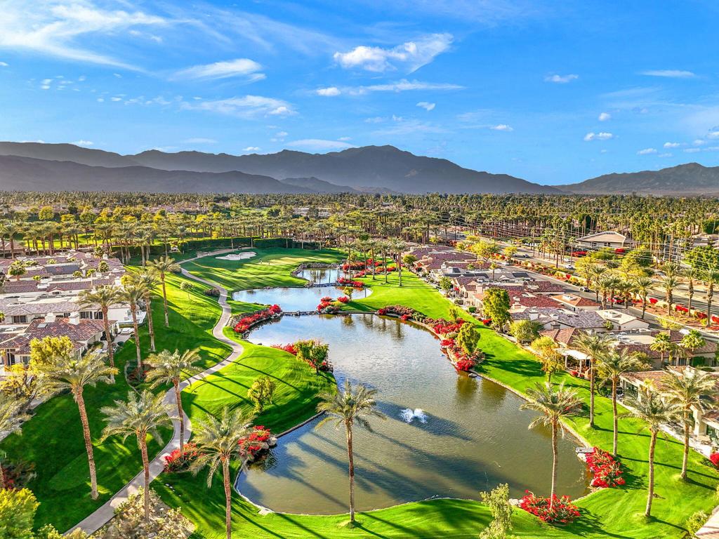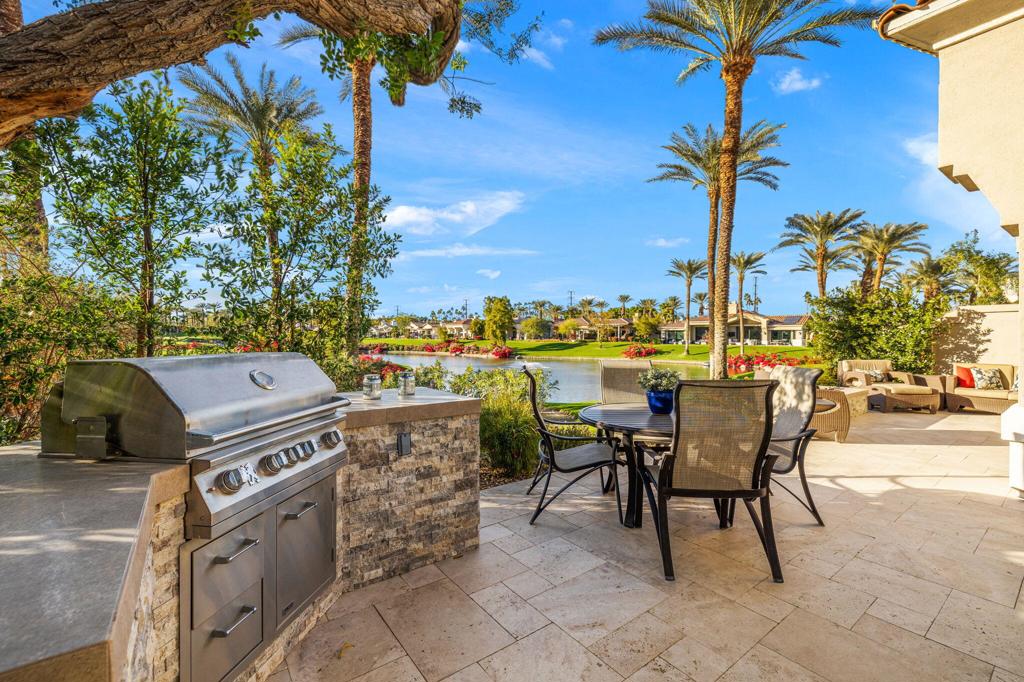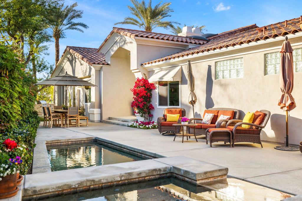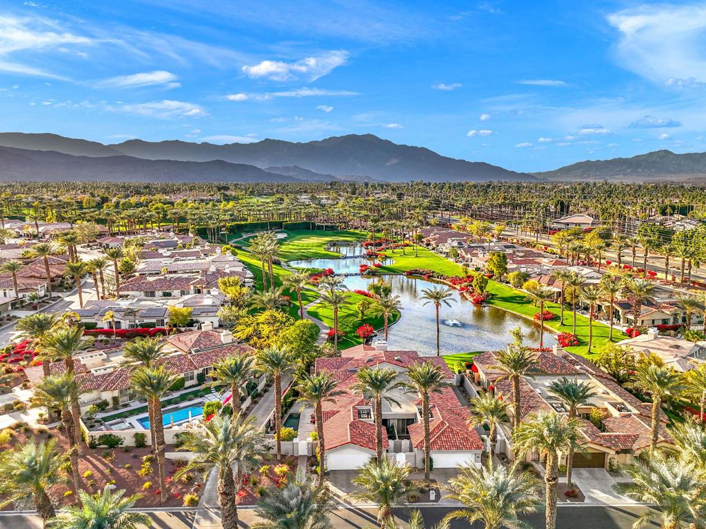 Welcome to the rare and stunning Acacia 5 home, a Palm Desert oasis featuring its own pool and spa in the beautiful flora and fauna of the private courtyard. Nestled in Indian Ridge Country Club, this home offers breathtaking panoramic views of serene lakes, cascading waterfalls, majestic mountains, and the signature 8th fairway of the Grove Golf Course. The newly expanded Travertine patio is an entertainer's dream, complete with a built-in BBQ island, ample seating, a cozy fire pit, and the perfect ambiance for enjoying spectacular desert sunsets with your favorite drink in hand. Inside, the spacious kitchen shines with newer stainless-steel appliances, a chic tile backsplash, peninsula bar seating, and a convenient desk area for organizing recipes or planning your next gathering. Luxurious new wood plank flooring and fresh carpeting in the bedrooms add a modern touch of elegance throughout the home. The primary suite features a charming outdoor seating area, perfect for savoring your morning coffee or unwinding with a good book. En-suite guest bedrooms ensure comfort and privacy for visiting family and friends. Doors and windows have been replaced and there is nothing left for you to do except bring your toothbrush. With views this extraordinary, you'll never want to leave. Offered furnished per inventory, with a Club Membership available with no wait. This is a rare opportunity to embrace the ultimate desert lifestyle--don't miss it!