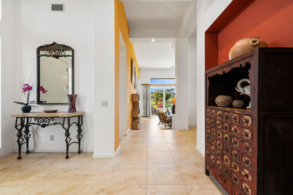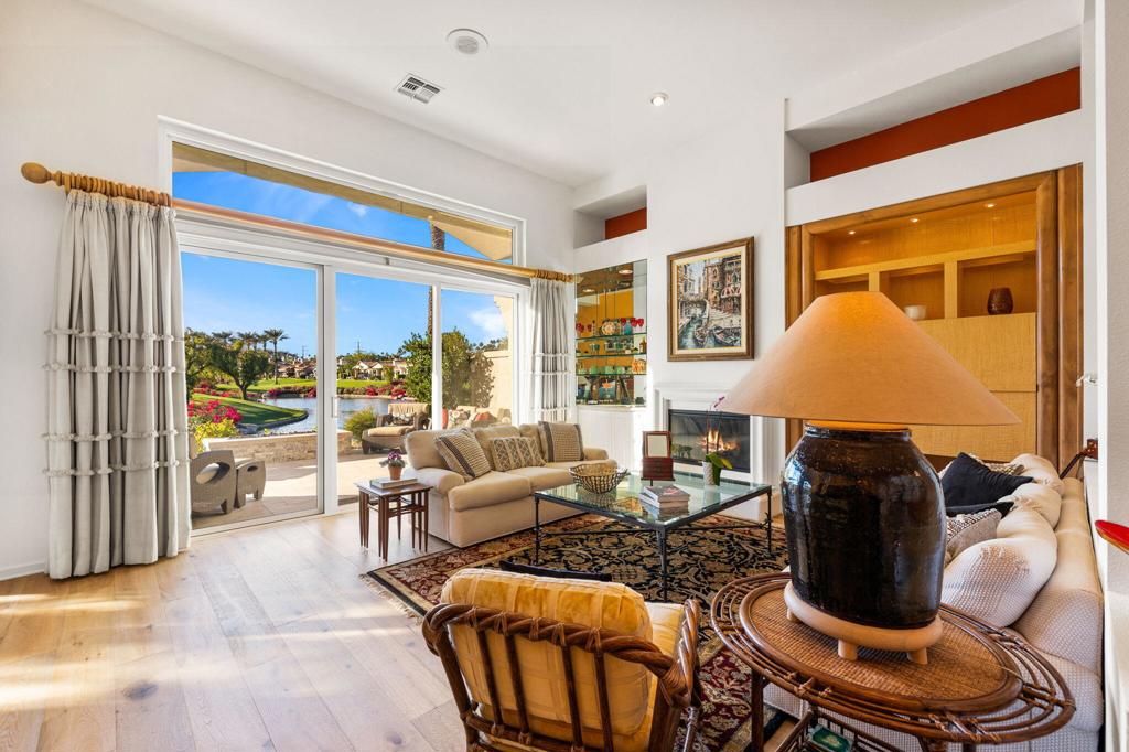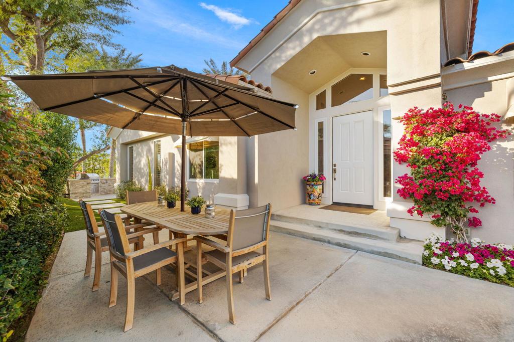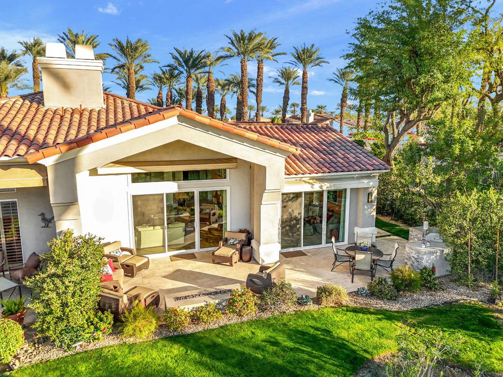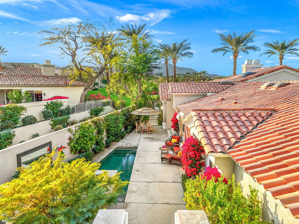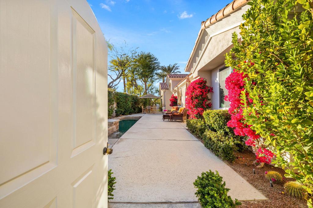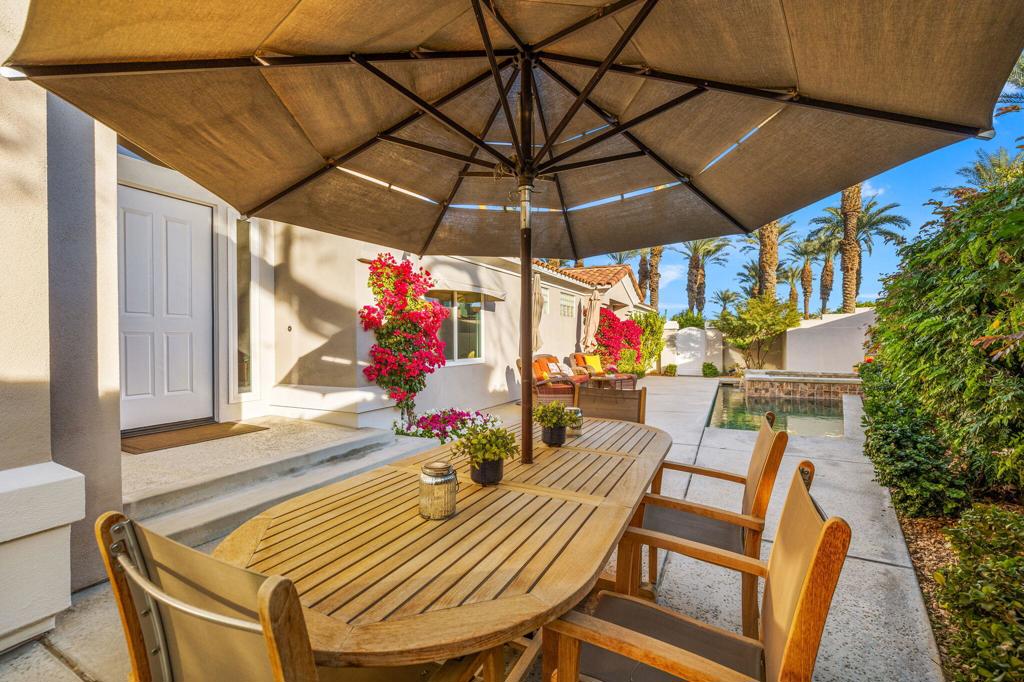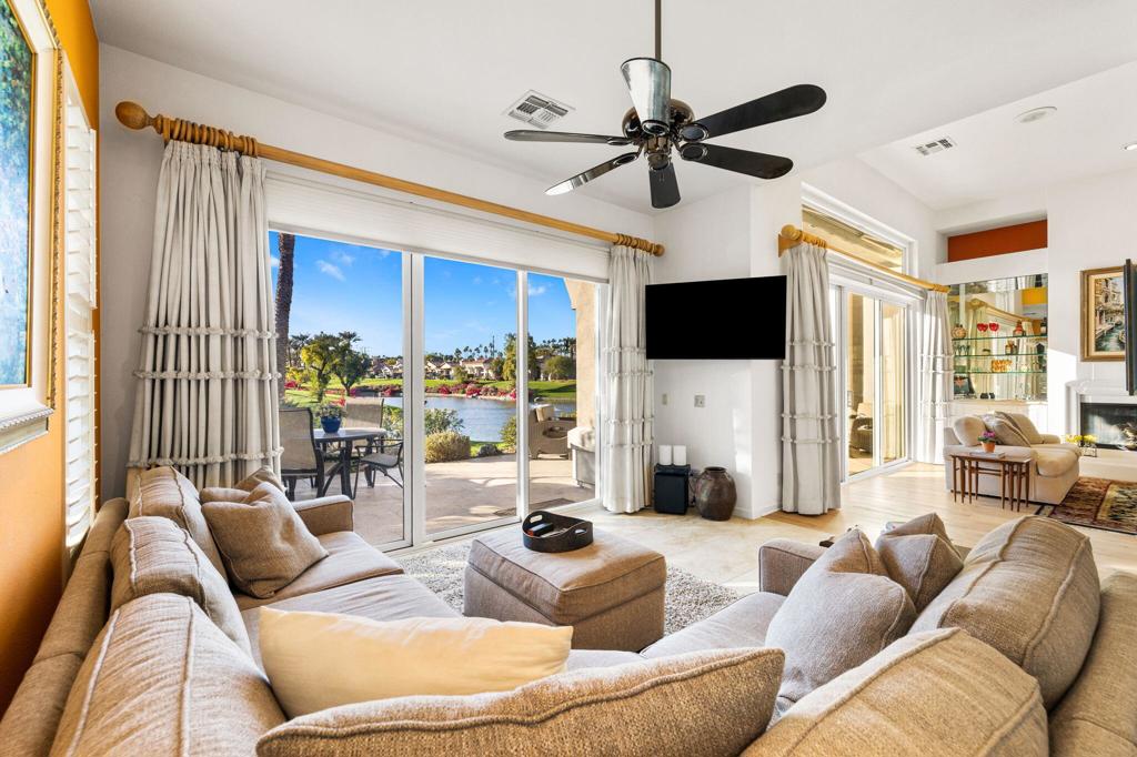 Welcome to the rare and stunning Acacia 5 home, a Palm Desert oasis featuring its own pool and spa in the beautiful flora and fauna of the private courtyard. Nestled in Indian Ridge Country Club, this home offers breathtaking panoramic views of serene lakes, cascading waterfalls, majestic mountains, and the signature 8th fairway of the Grove Golf Course. The newly expanded Travertine patio is an entertainer's dream, complete with a built-in BBQ island, ample seating, a cozy fire pit, and the perfect ambiance for enjoying spectacular desert sunsets with your favorite drink in hand. Inside, the spacious kitchen shines with newer stainless-steel appliances, a chic tile backsplash, peninsula bar seating, and a convenient desk area for organizing recipes or planning your next gathering. Luxurious new wood plank flooring and fresh carpeting in the bedrooms add a modern touch of elegance throughout the home. The primary suite features a charming outdoor seating area, perfect for savoring your morning coffee or unwinding with a good book. En-suite guest bedrooms ensure comfort and privacy for visiting family and friends. Doors and windows have been replaced and there is nothing left for you to do except bring your toothbrush. With views this extraordinary, you'll never want to leave. Offered furnished per inventory, with a Club Membership available with no wait. This is a rare opportunity to embrace the ultimate desert lifestyle--don't miss it!