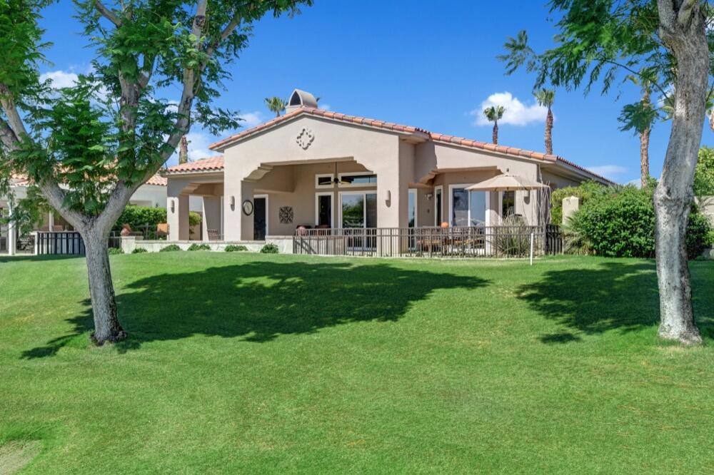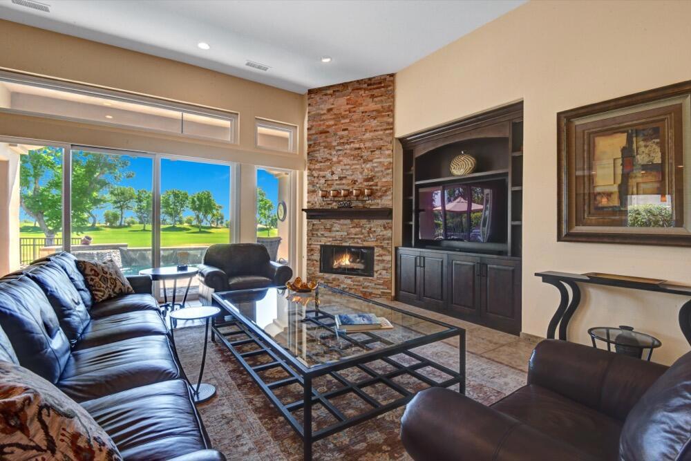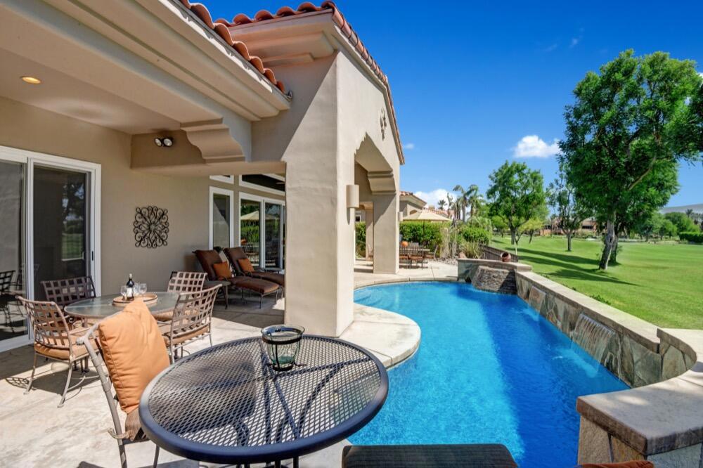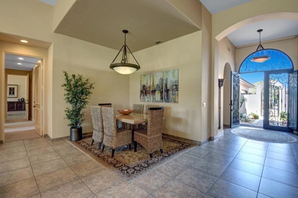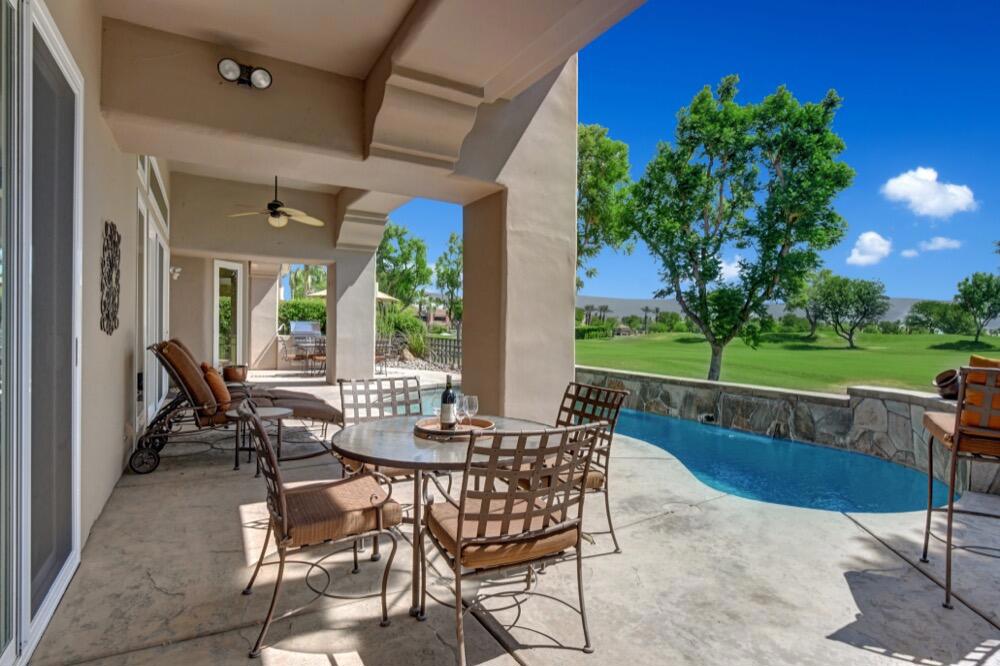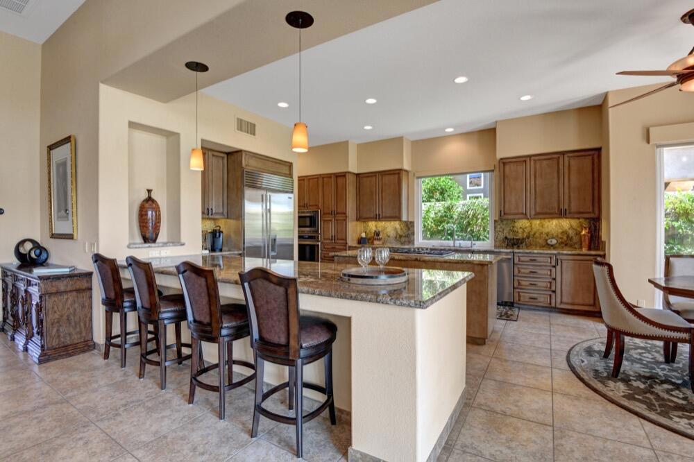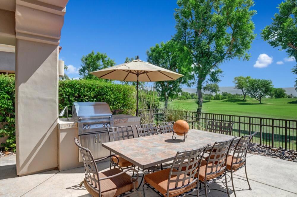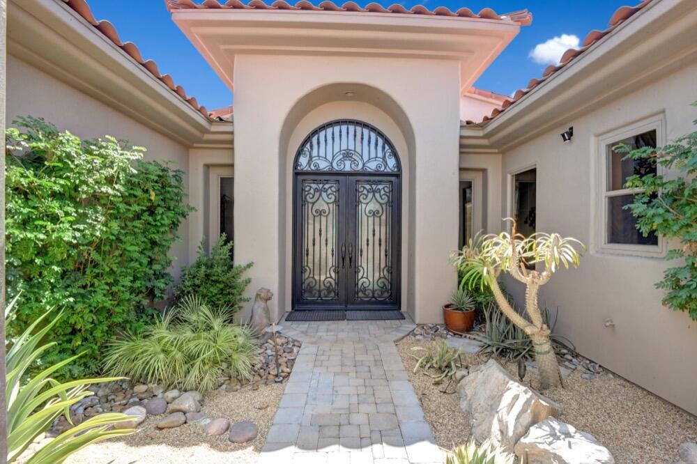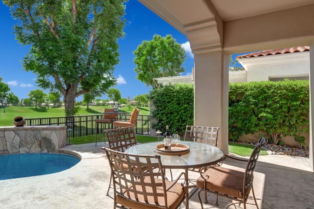 Experience the extraordinary upgrades and breathtaking vistas of one of the most popular floor plans in Indian Ridge Country Club in Palm Desert. This Ocotillo 1, 3082sf, 3 bedroom, 3.5 bathrooms has been meticulously perfected where every detail was attended to. As you step into the nicely landscaped courtyard, you'll be greeted by inviting paved walkways leading you through the large double wrought-iron and glass arched doorway. A unique highlight of this property is the transformation of the bar area into a stylish dining space, enhancing the overall ambiance for hosting guests. The former dining room has been reimagined into a versatile office/den or 4th sleeping area, complete with pocket sliding doors. There are three guest bedrooms, each with their own private baths, and an additional powder bath. Granite countertops and elegant tile embellish the entirety of this home, beautifully complementing the stack stone fireplace and the popular great room floor plan. The house has newer windows and doors in almost every area of the home. And, did we mention ''owned'' solar - sure to keep your summer air conditioning bills in check. The captivating back patio has been thoughtfully designed for entertaining featuring a built-in barbecue and pristine Pebble Tec saltwater pool. This home exudes enchantment and comes Furnished per Inventory List. Some furnishings have been removed and substituted from those shown in the MLS photos. Home registered with Golf membership.
