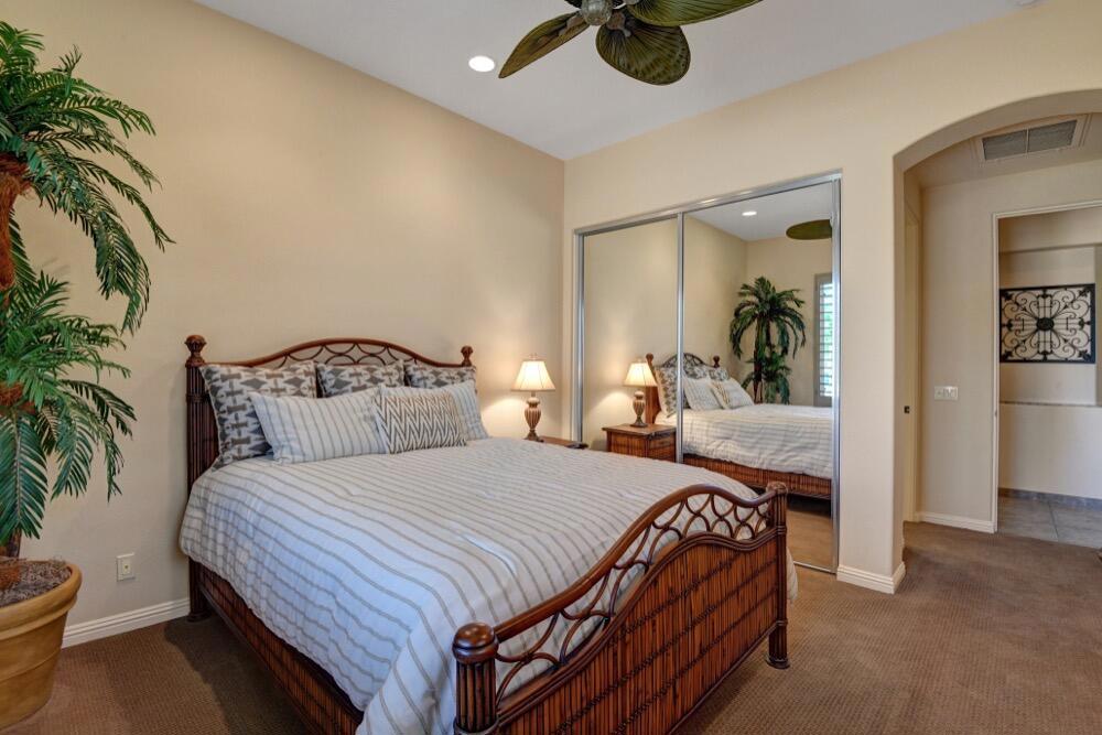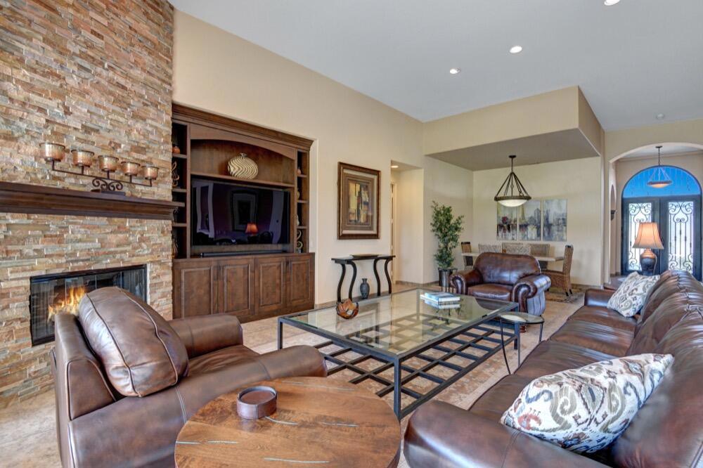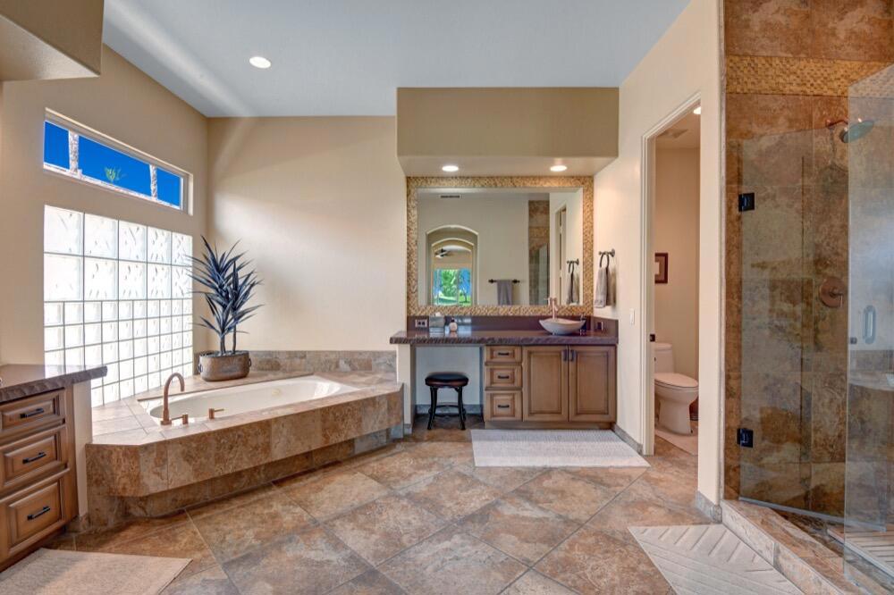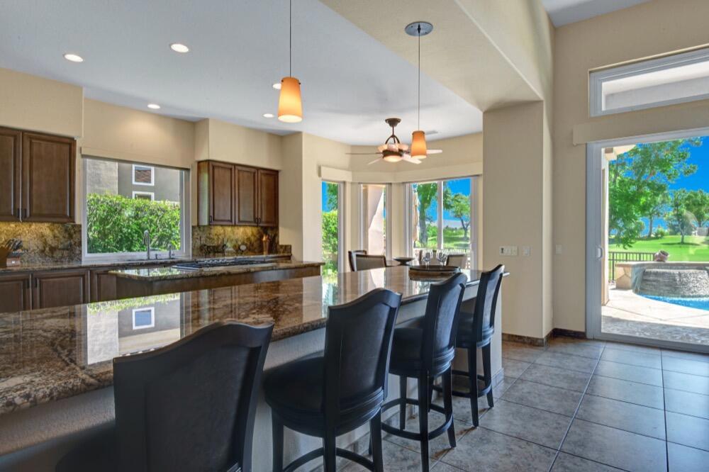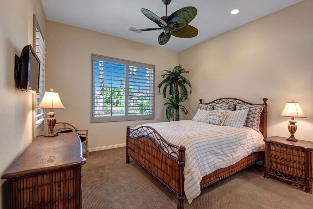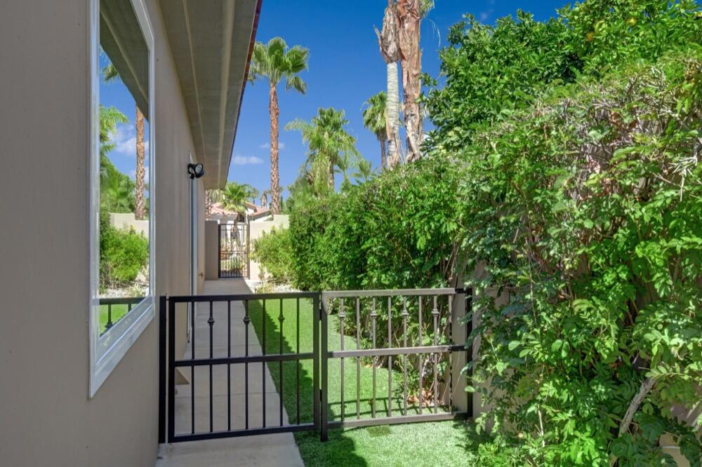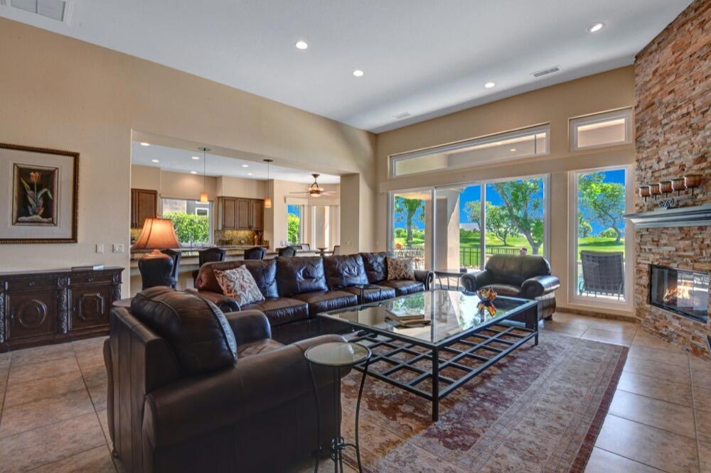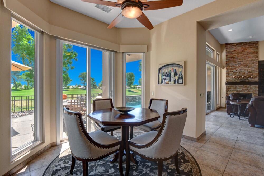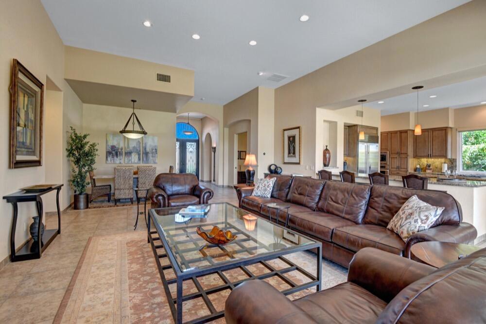 Experience the extraordinary upgrades and breathtaking vistas of one of the most popular floor plans in Indian Ridge Country Club in Palm Desert. This Ocotillo 1, 3082sf, 3 bedroom, 3.5 bathrooms has been meticulously perfected where every detail was attended to. As you step into the nicely landscaped courtyard, you'll be greeted by inviting paved walkways leading you through the large double wrought-iron and glass arched doorway. A unique highlight of this property is the transformation of the bar area into a stylish dining space, enhancing the overall ambiance for hosting guests. The former dining room has been reimagined into a versatile office/den or 4th sleeping area, complete with pocket sliding doors. There are three guest bedrooms, each with their own private baths, and an additional powder bath. Granite countertops and elegant tile embellish the entirety of this home, beautifully complementing the stack stone fireplace and the popular great room floor plan. The house has newer windows and doors in almost every area of the home. And, did we mention ''owned'' solar - sure to keep your summer air conditioning bills in check. The captivating back patio has been thoughtfully designed for entertaining featuring a built-in barbecue and pristine Pebble Tec saltwater pool. This home exudes enchantment and comes Furnished per Inventory List. Some furnishings have been removed and substituted from those shown in the MLS photos. Home registered with Golf membership.