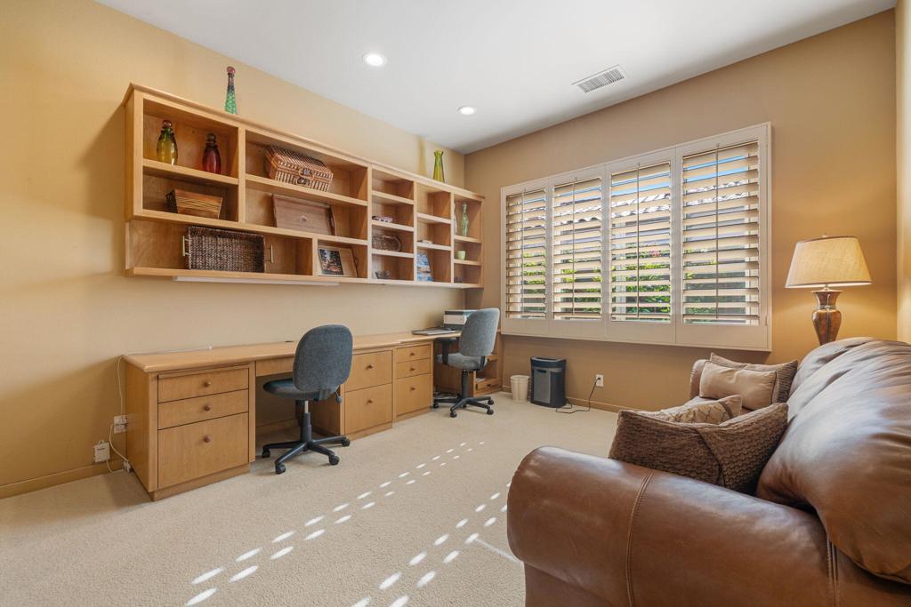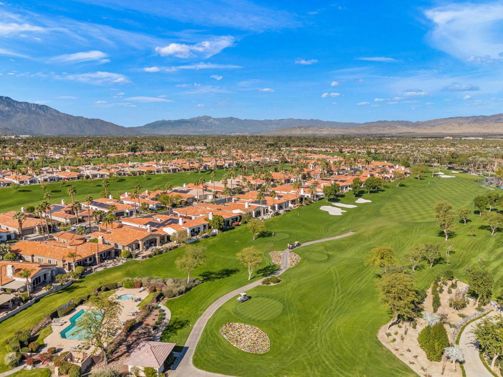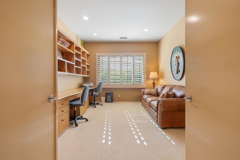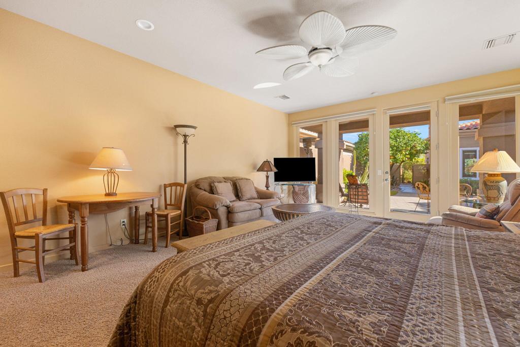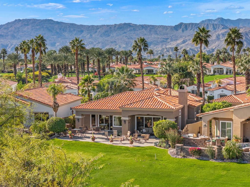 Set on an elevated lot, this sought-after Ocotillo 2 delivers sweeping views across three fairways, the driving range, and dramatic mountain backdrops spanning the Grove and Arroyo courses. Outdoor living shines with a generously sized, elevated patio finished with pavers, a fire pit, and a built-in BBQ perfect for entertaining or simply soaking in the scenery. The popular Ocotillo 2 floor plan features a light-filled great room where the living, dining, and family areas flow seamlessly to the patio, all oriented to capture the incredible views. Custom built-ins enhance both the living and family rooms, while a wet bar overlooks the outdoor living space. A formal dining room sits just off the entry, and the kitchen offers a breakfast bar that opens to the family room for easy entertaining. The primary suite offers a peaceful courtyard outlook and is complete with dual vanities, a soaking tub, a separate shower, and two closets--one a generous walk-in. Two additional ensuite guest rooms are located in the main house, with one currently styled as a home office with custom built-ins. A standout feature is the detached custom casita, privately positioned off the front courtyard. It includes a bedroom, bathroom, compact kitchenette, and its own laundry area ideal for guests or extended stays. Additional highlights include an attached two-car garage plus golf cart garage, furnishings offered per inventory, and a Club Membership available with no wait. Golf membership available per wait list.