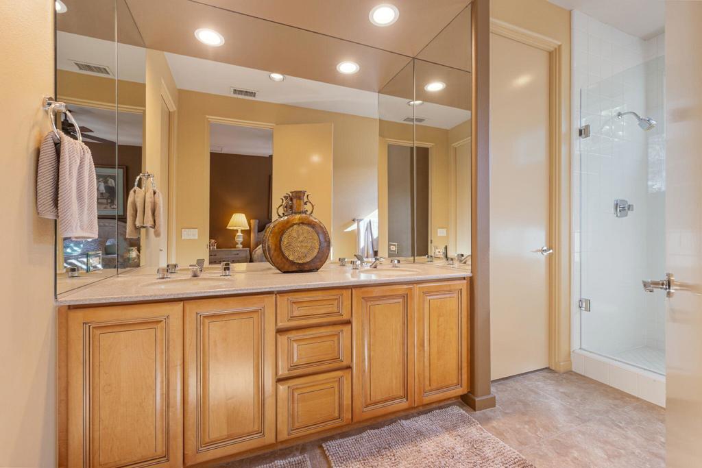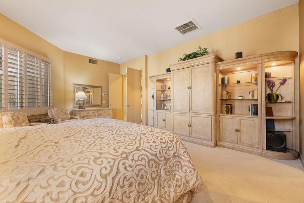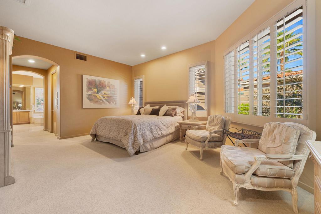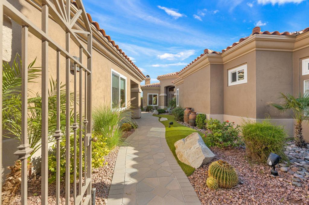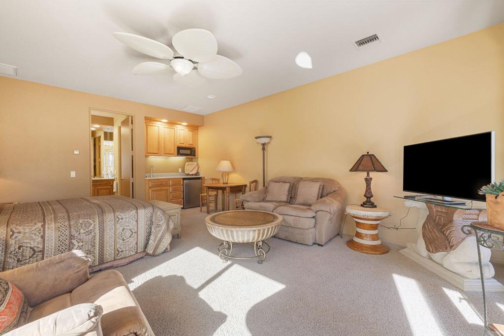 Set on an elevated lot, this sought-after Ocotillo 2 delivers sweeping views across three fairways, the driving range, and dramatic mountain backdrops spanning the Grove and Arroyo courses. Outdoor living shines with a generously sized, elevated patio finished with pavers, a fire pit, and a built-in BBQ perfect for entertaining or simply soaking in the scenery. The popular Ocotillo 2 floor plan features a light-filled great room where the living, dining, and family areas flow seamlessly to the patio, all oriented to capture the incredible views. Custom built-ins enhance both the living and family rooms, while a wet bar overlooks the outdoor living space. A formal dining room sits just off the entry, and the kitchen offers a breakfast bar that opens to the family room for easy entertaining. The primary suite offers a peaceful courtyard outlook and is complete with dual vanities, a soaking tub, a separate shower, and two closets--one a generous walk-in. Two additional ensuite guest rooms are located in the main house, with one currently styled as a home office with custom built-ins. A standout feature is the detached custom casita, privately positioned off the front courtyard. It includes a bedroom, bathroom, compact kitchenette, and its own laundry area ideal for guests or extended stays. Additional highlights include an attached two-car garage plus golf cart garage, furnishings offered per inventory, and a Club Membership available with no wait. Golf membership available per wait list.