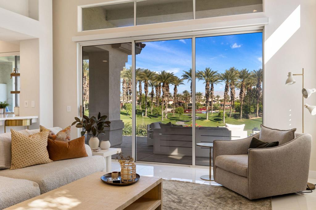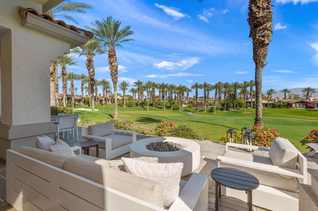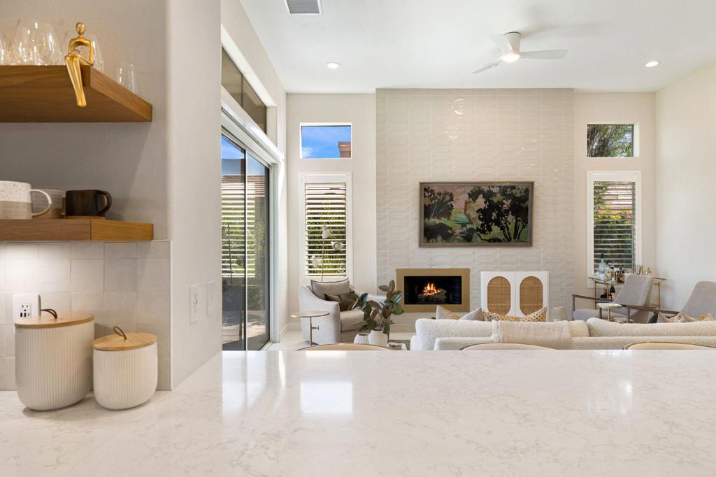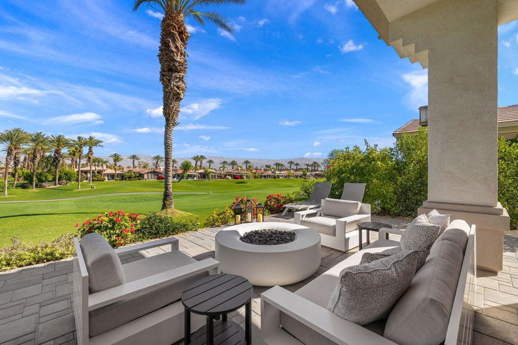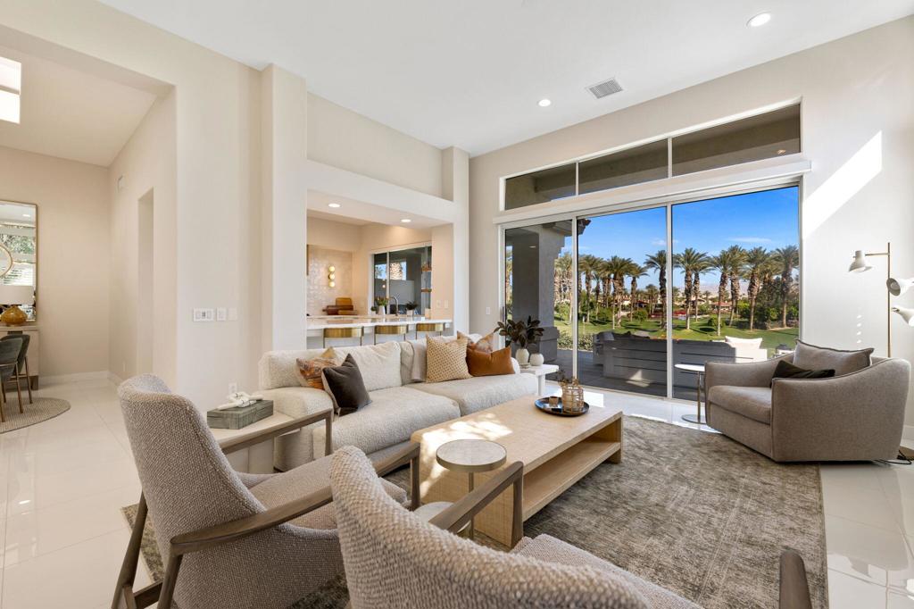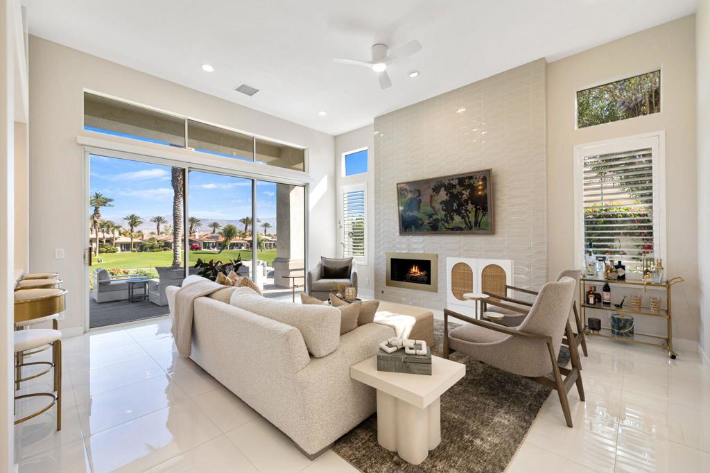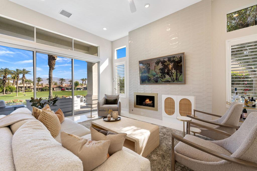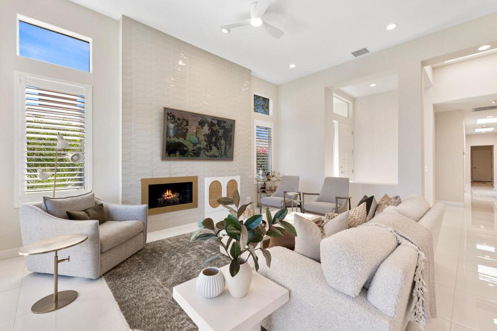 Prepare to be captivated by this stunningly updated Acacia 3 floor plan at Indian Ridge. The entire living area boasts exquisite porcelain flooring, complemented by a beautifully tiled fireplace and designer furnishings that grace every room. The gourmet kitchen is a Chef's dream, featuring all-new cabinets, quartz countertops, wine refrigerator and top-of-the-line appliances including a paneled Jennair refrigerator and Miele dishwasher, offering both style and functionality. Step outside to the outdoor living space, perfect for relaxation or entertaining, featuring an extended patio with pavers, a BBQ area, and breathtaking views of the 4th hole of The Grove course. The home's bedrooms feature new carpeting, while the bathrooms boast new cabinets, quartz countertops, new lighting and new toilets. A new HVAC system is a huge feature as well as A/C for the garage and shutters and remote blinds throughout the home. Being offered furnished per the inventory list. Ask us about different Membership options available for this home.