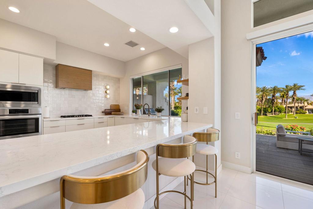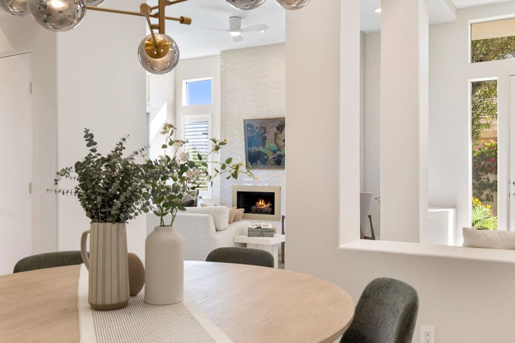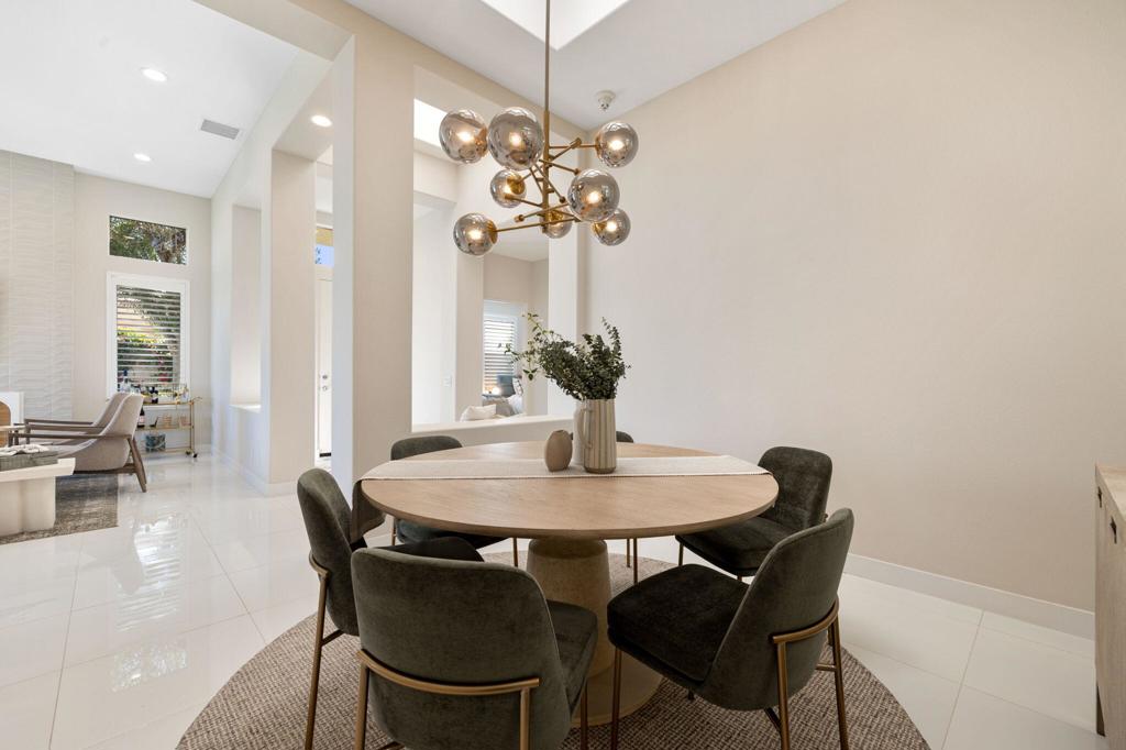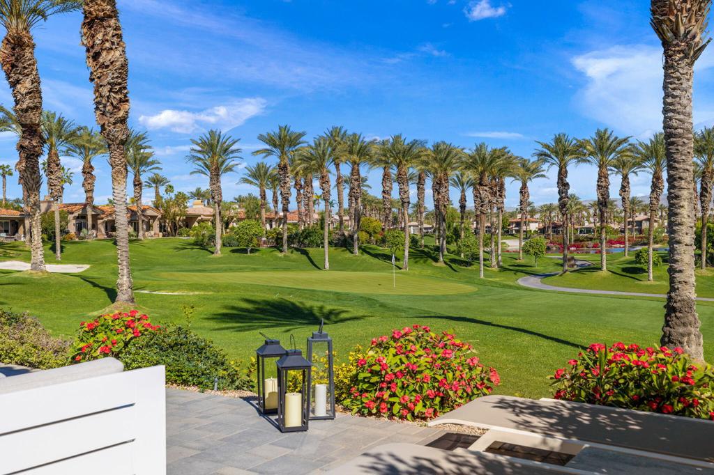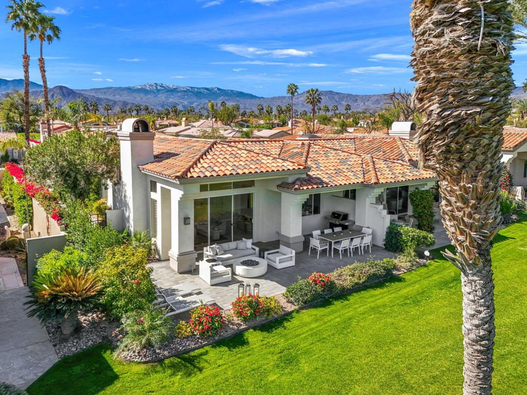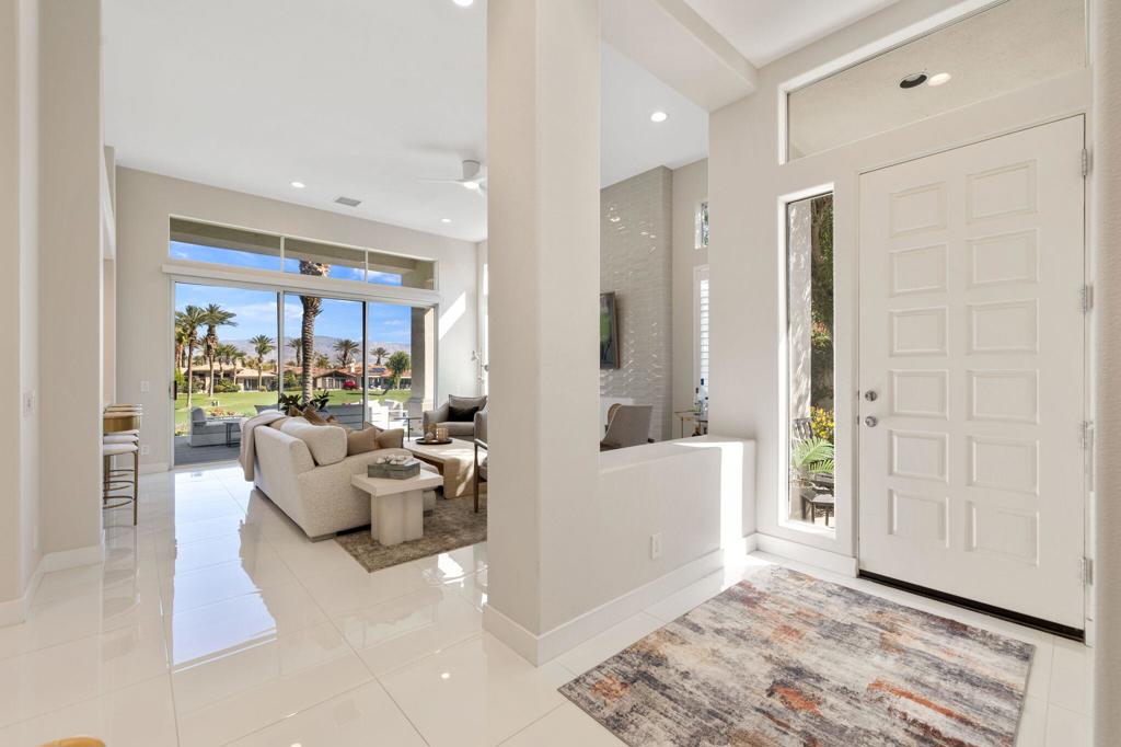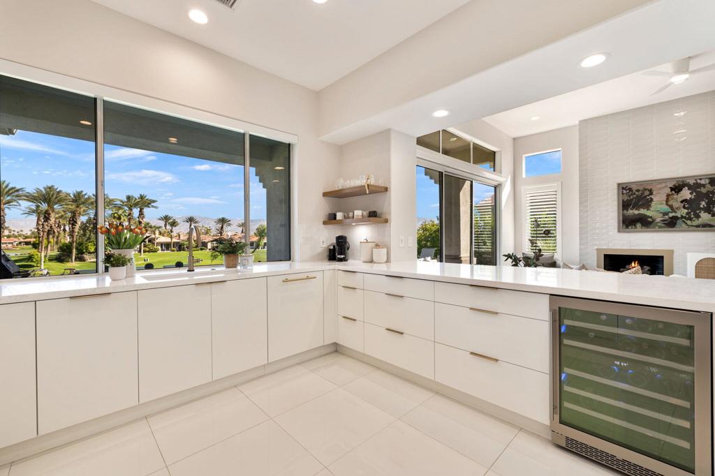 Prepare to be captivated by this stunningly updated Acacia 3 floor plan at Indian Ridge. The entire living area boasts exquisite porcelain flooring, complemented by a beautifully tiled fireplace and designer furnishings that grace every room. The gourmet kitchen is a Chef's dream, featuring all-new cabinets, quartz countertops, wine refrigerator and top-of-the-line appliances including a paneled Jennair refrigerator and Miele dishwasher, offering both style and functionality. Step outside to the outdoor living space, perfect for relaxation or entertaining, featuring an extended patio with pavers, a BBQ area, and breathtaking views of the 4th hole of The Grove course. The home's bedrooms feature new carpeting, while the bathrooms boast new cabinets, quartz countertops, new lighting and new toilets. A new HVAC system is a huge feature as well as A/C for the garage and shutters and remote blinds throughout the home. Being offered furnished per the inventory list. Ask us about different Membership options available for this home.