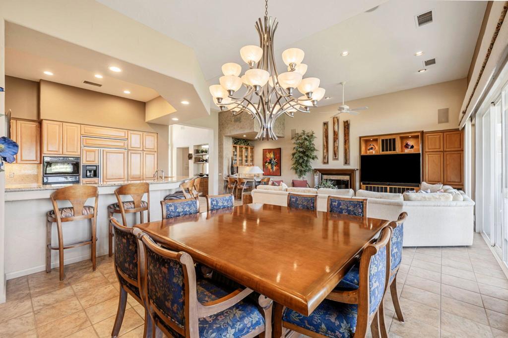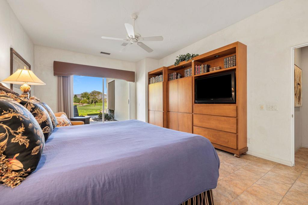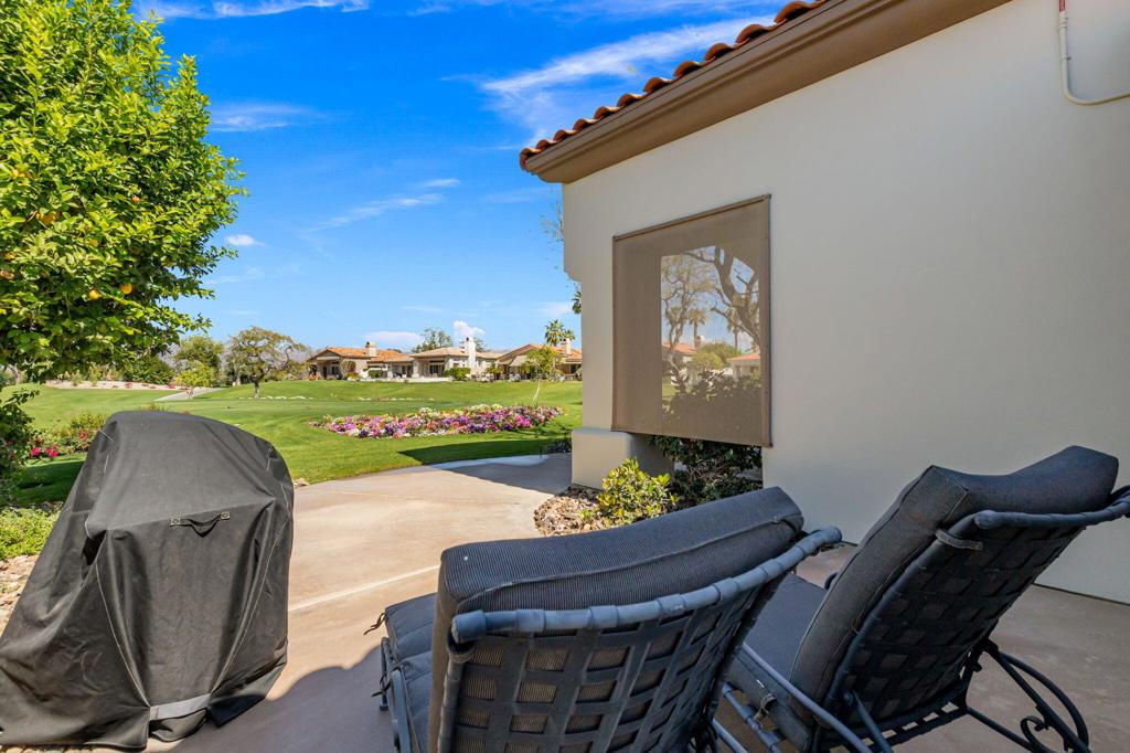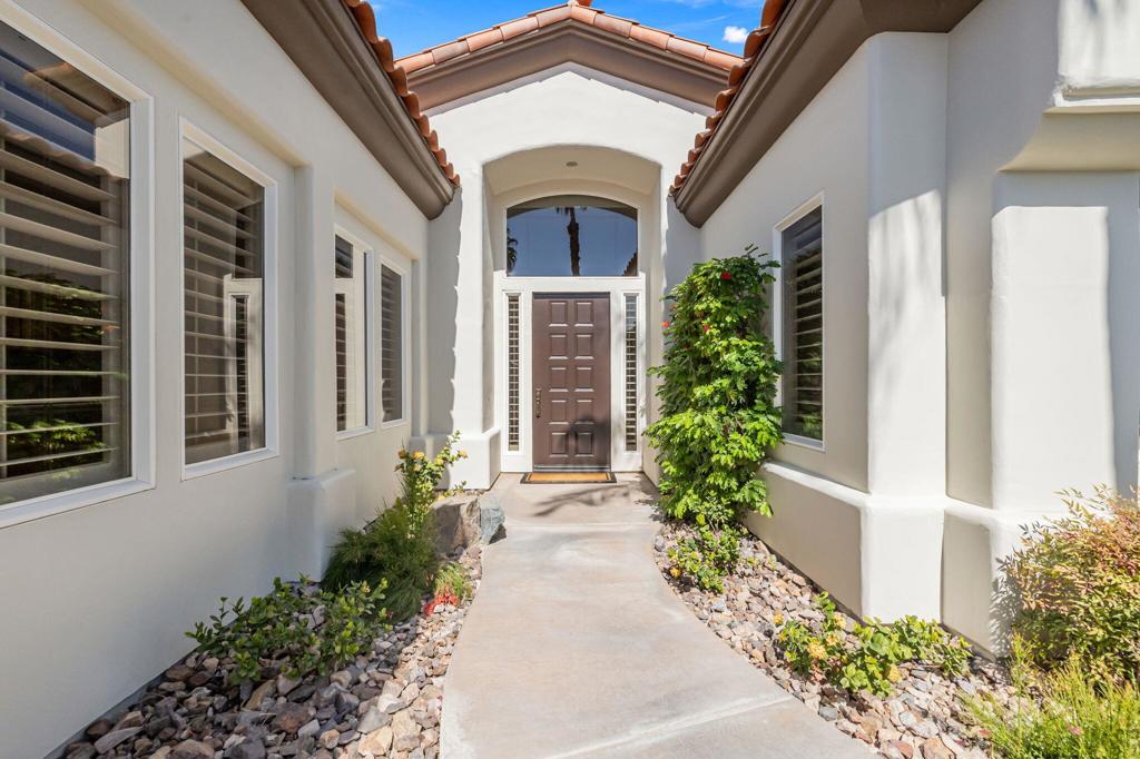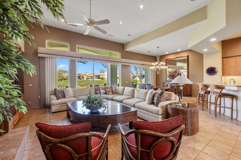 Commanding sweeping fairway and mountain views, this highly desirable Bougainvillea 1 residence overlooks the 18th hole of the Grove Course and the Indian Ridge driving range, offering an exceptional setting within Indian Ridge Country Club. Positioned on an expansive 8,712 sq. ft. pie-shaped lot, the property presents a rare opportunity to create the ultimate private desert retreat, with potential space for a pool, spa, and/or detached casita. Designed to embrace the surrounding views, the home features a bright and open great-room layout where the living room, dining area, and kitchen seamlessly flow to the outdoor patio creating effortless indoor-outdoor desert living and entertaining. The residence has been beautifully maintained and thoughtfully upgraded, showcasing tile flooring throughout, plantation shutters, custom interior wall finishes, and newer HVAC systems. The inviting living room is anchored by a custom fireplace mantle and built-in entertainment center, while the kitchen offers upgraded wood cabinetry and quality appliances for both everyday living and entertaining. The primary suite is a peaceful retreat with private patio access and picturesque fairway views, complemented by an ensuite bath featuring updated sinks and fixtures. Two additional guest suites each include their own bathrooms, with one currently configured as a comfortable home office. Additionally solar lease was installed in 2024 creating an optimum in energy savings. Club Membership is available to the buyer with no wait. Golf membership available per waitlist.