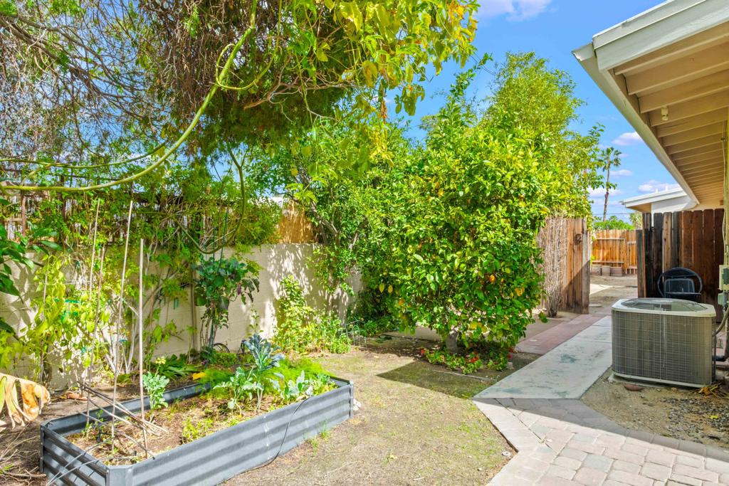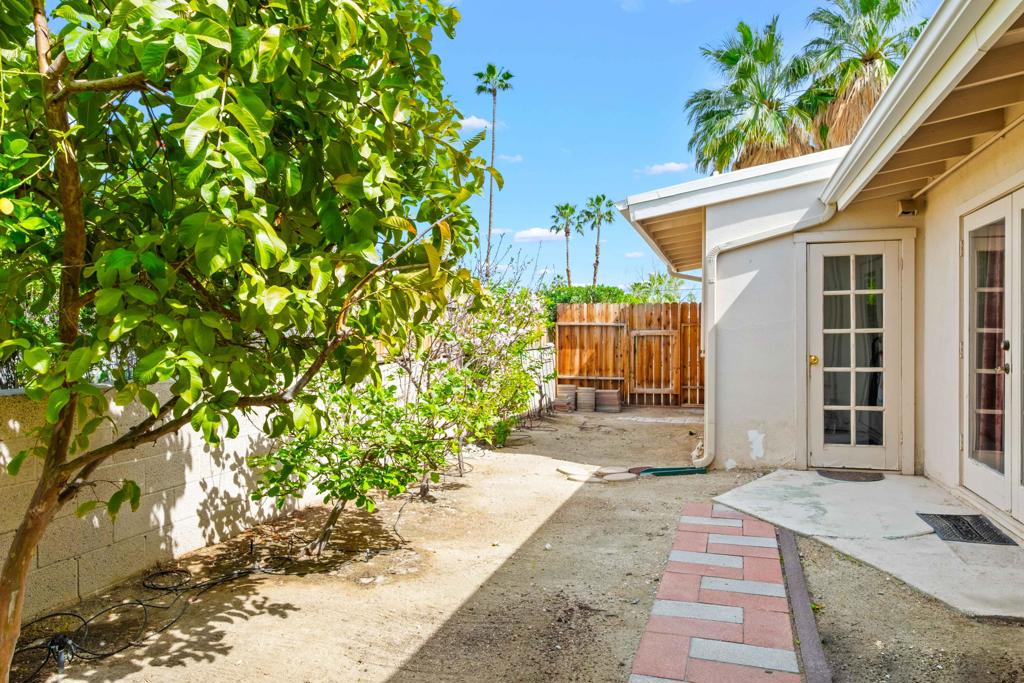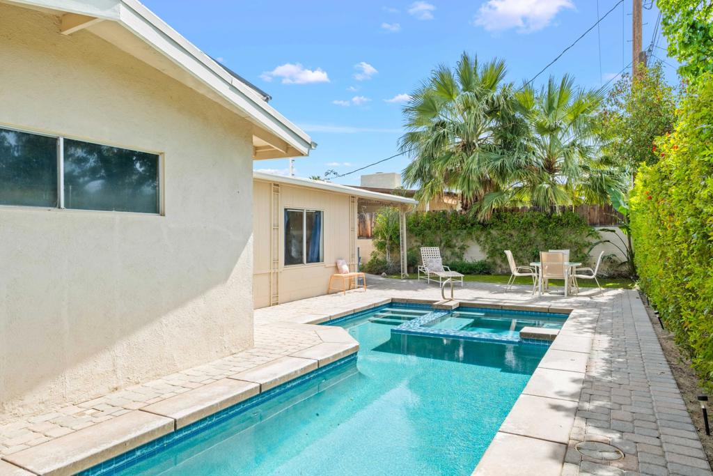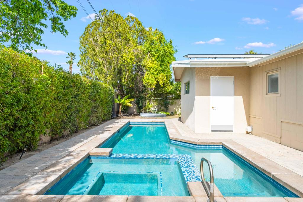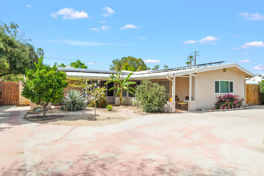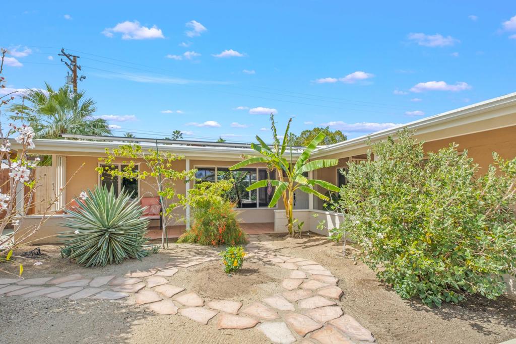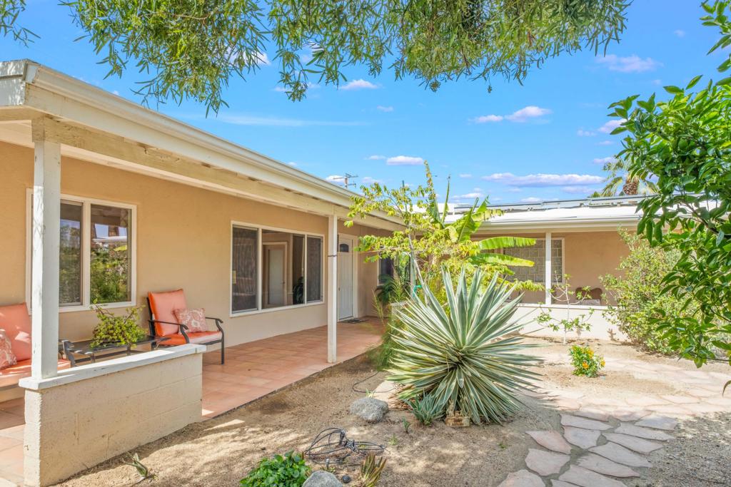 Discover the allure of Palm Desert living with this captivating mid-century residence, ideally situated near the vibrant shops and eateries of El Paseo. Boasting 2 bedrooms and 2 baths in the main dwelling, this home offers a blend of comfort and potential for creative enhancement. The primary bedroom features a spacious room, with closet as well as en-suite shower and sink for added convenience. The attached casita is currently occupied as an income producing property featuring a bathroom, closet, and shared separate laundry facilities. Entertain guests in the intimate living room, adorned with ceramic tile flooring and a striking stone corner fireplace. Flexibility abounds with additional space offering endless possibilities to expand the kitchen, living area, or convert into an additional bedroom or sunroom. Step outside into the lush backyard oasis, featuring a serene pebble tec pool and spa surrounded by mature fruit trees and an herb garden. Ample space in the front yard offers potential for expansion, allowing buyers the opportunity to customize and enlarge the footprint as desired. The home includes leased solar at $265 per month making the electric bills affordable! Embrace the quintessential Palm Desert lifestyle in this charming retreat, where every corner exudes warmth and possibility. Don't miss your chance to make this your dream desert haven. Square footage to be verified by the buyer. Schedule your showing today!