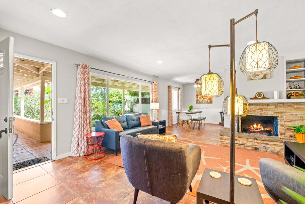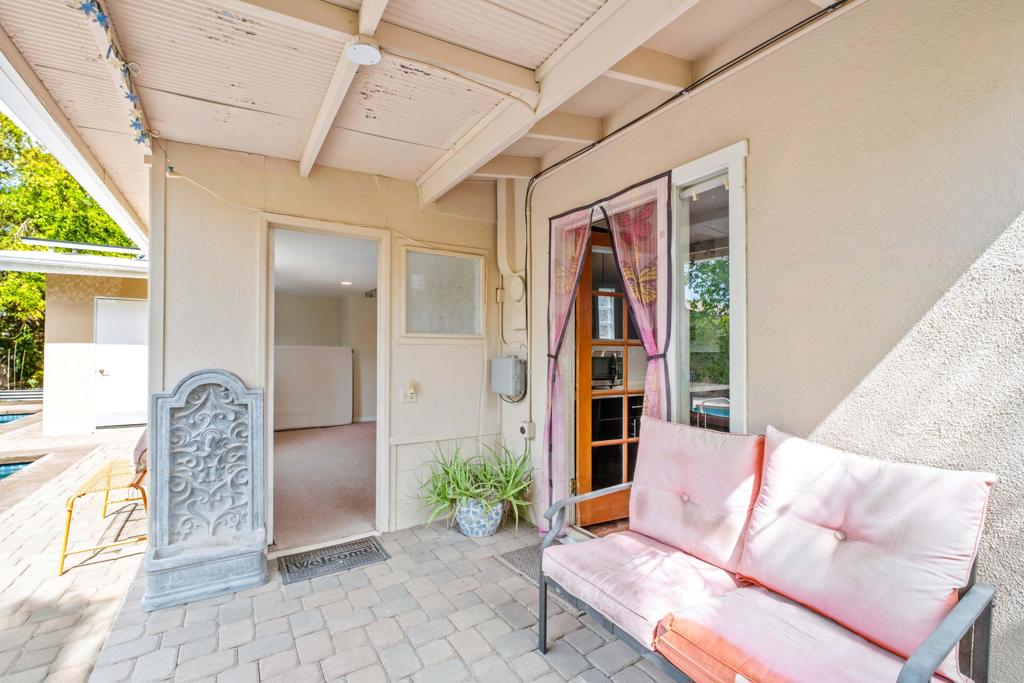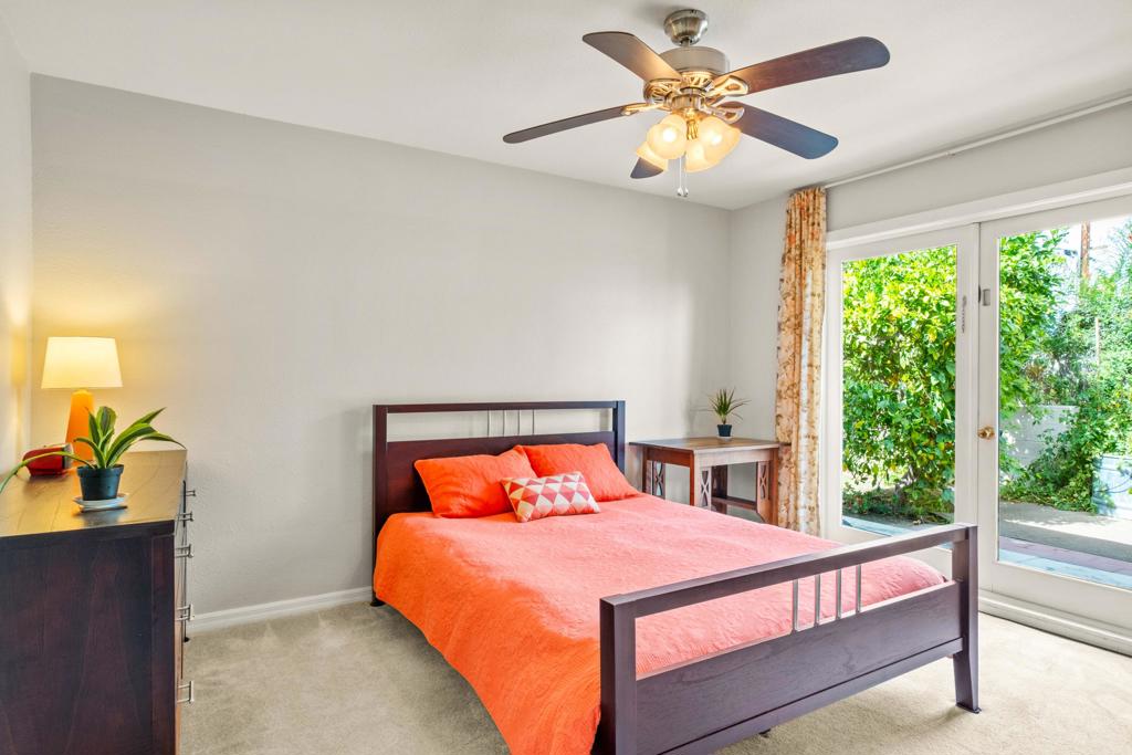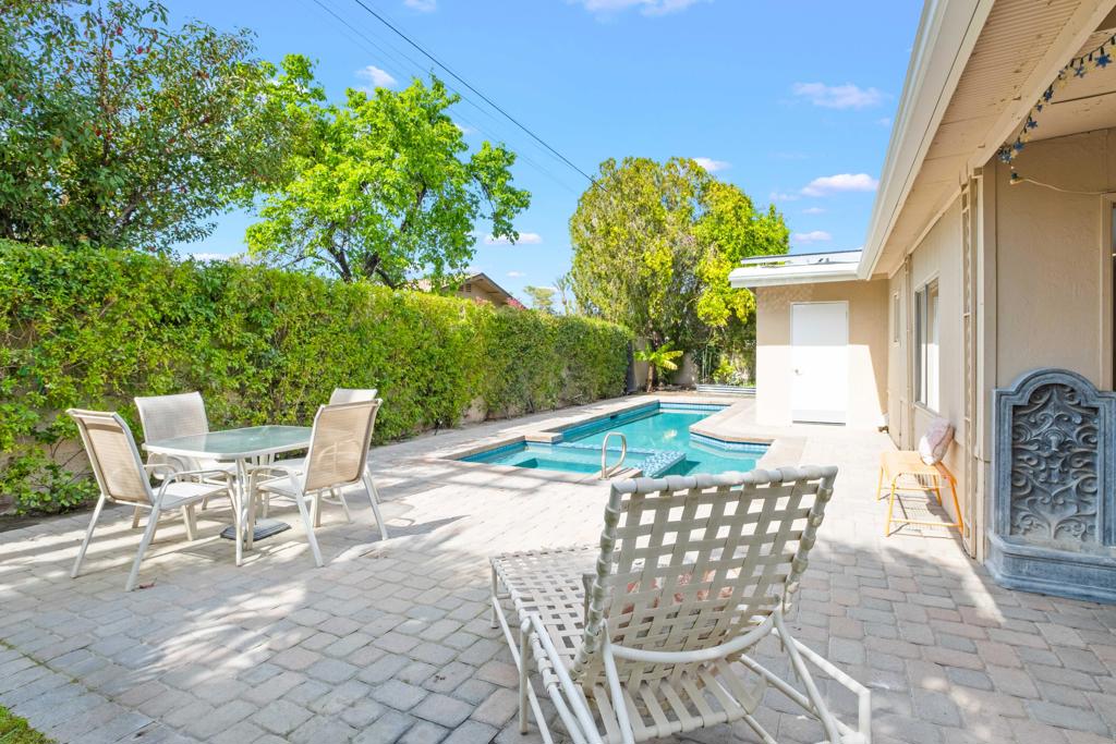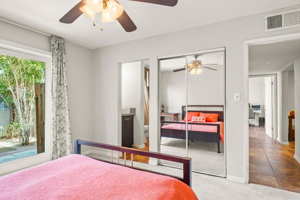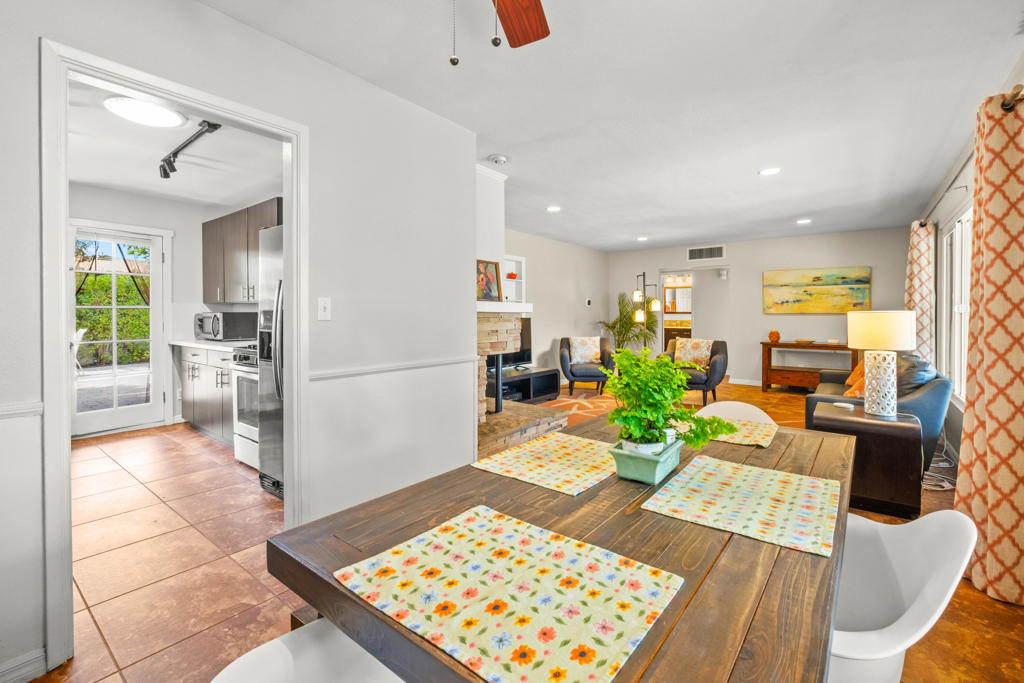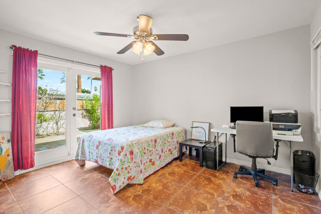Discover the allure of Palm Desert living with this captivating mid-century residence, ideally situated near the vibrant shops and eateries of El Paseo. Boasting 2 bedrooms and 2 baths in the main dwelling, this home offers a blend of comfort and potential for creative enhancement. The primary bedroom features a spacious room, with closet as well as en-suite shower and sink for added convenience. The attached casita is currently occupied as an income producing property featuring a bathroom, closet, and shared separate laundry facilities. Entertain guests in the intimate living room, adorned with ceramic tile flooring and a striking stone corner fireplace. Flexibility abounds with additional space offering endless possibilities to expand the kitchen, living area, or convert into an additional bedroom or sunroom. Step outside into the lush backyard oasis, featuring a serene pebble tec pool and spa surrounded by mature fruit trees and an herb garden. Ample space in the front yard offers potential for expansion, allowing buyers the opportunity to customize and enlarge the footprint as desired. The home includes leased solar at $265 per month making the electric bills affordable! Embrace the quintessential Palm Desert lifestyle in this charming retreat, where every corner exudes warmth and possibility. Don't miss your chance to make this your dream desert haven. Square footage to be verified by the buyer. Schedule your showing today!