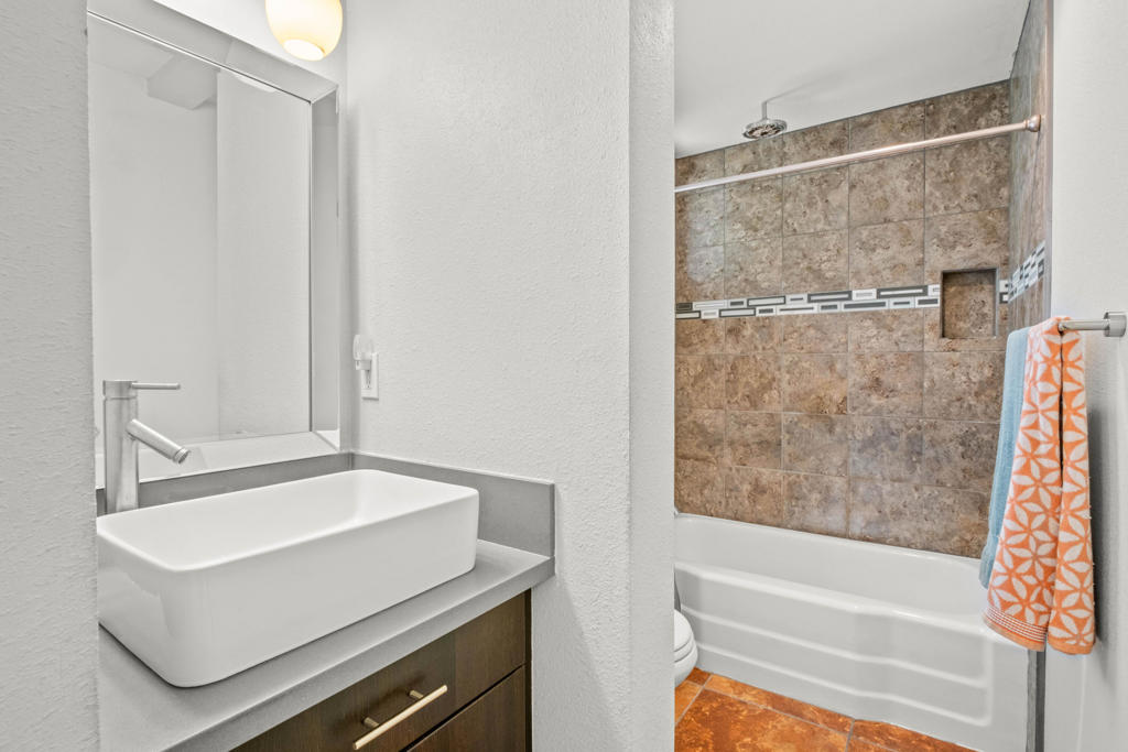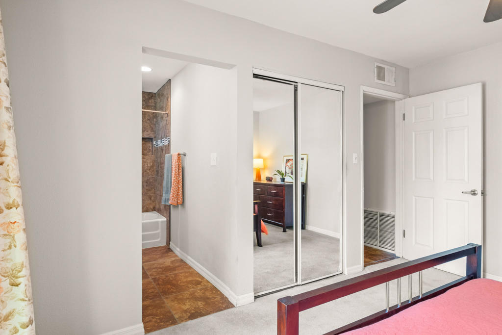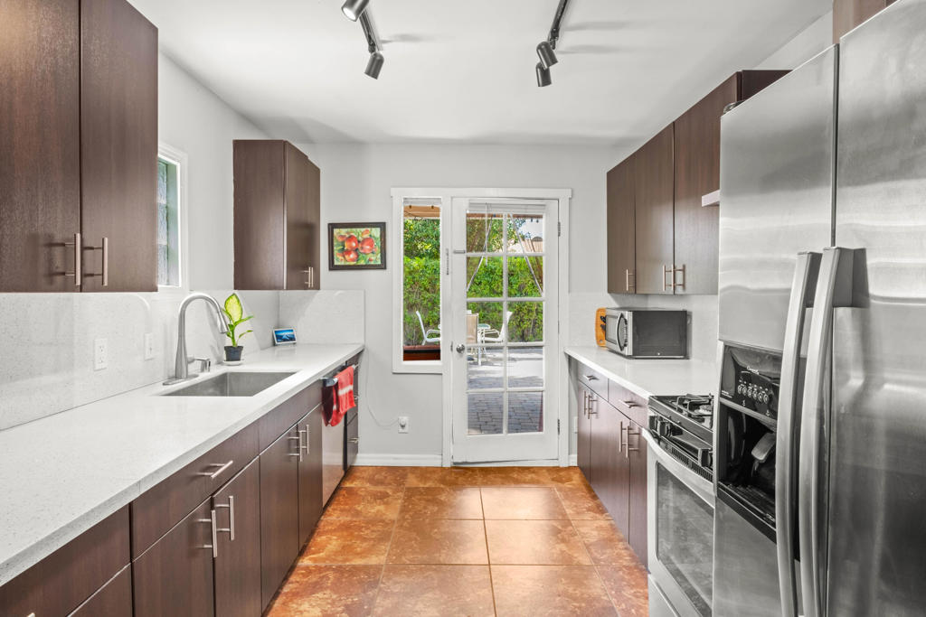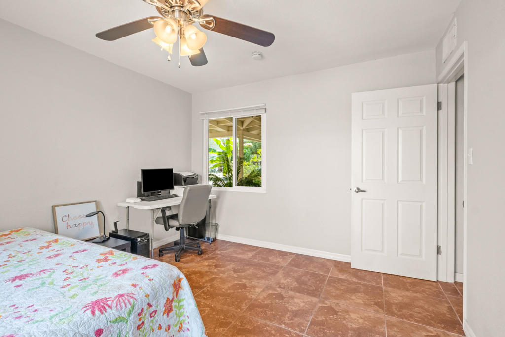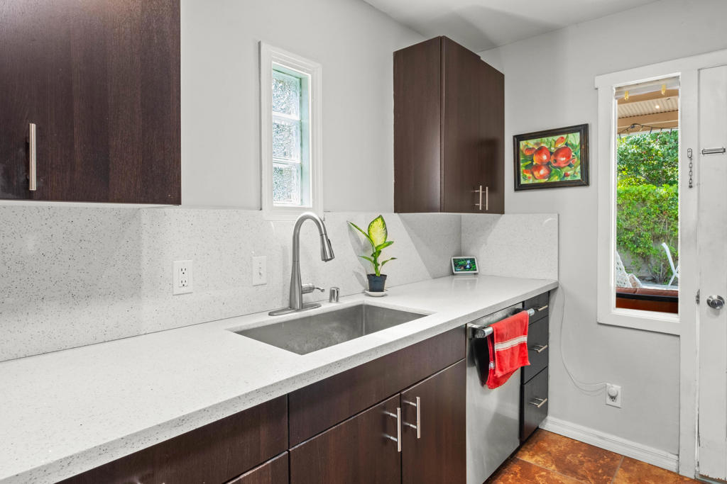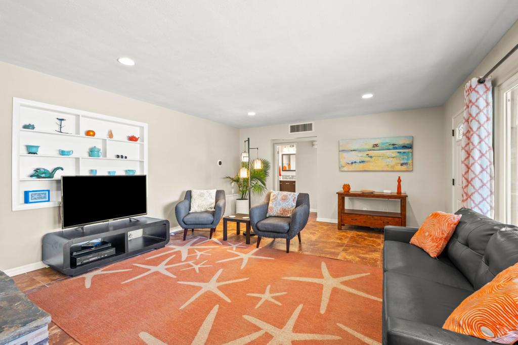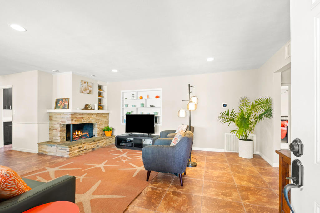 Discover the allure of Palm Desert living with this captivating mid-century residence, ideally situated near the vibrant shops and eateries of El Paseo. Boasting 2 bedrooms and 2 baths in the main dwelling, this home offers a blend of comfort and potential for creative enhancement. The primary bedroom features a spacious room, with closet as well as en-suite shower and sink for added convenience. The attached casita is currently occupied as an income producing property featuring a bathroom, closet, and shared separate laundry facilities. Entertain guests in the intimate living room, adorned with ceramic tile flooring and a striking stone corner fireplace. Flexibility abounds with additional space offering endless possibilities to expand the kitchen, living area, or convert into an additional bedroom or sunroom. Step outside into the lush backyard oasis, featuring a serene pebble tec pool and spa surrounded by mature fruit trees and an herb garden. Ample space in the front yard offers potential for expansion, allowing buyers the opportunity to customize and enlarge the footprint as desired. The home includes leased solar at $265 per month making the electric bills affordable! Embrace the quintessential Palm Desert lifestyle in this charming retreat, where every corner exudes warmth and possibility. Don't miss your chance to make this your dream desert haven. Square footage to be verified by the buyer. Schedule your showing today!