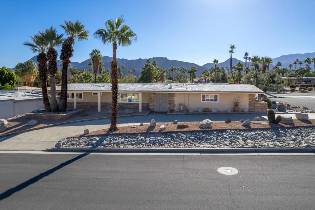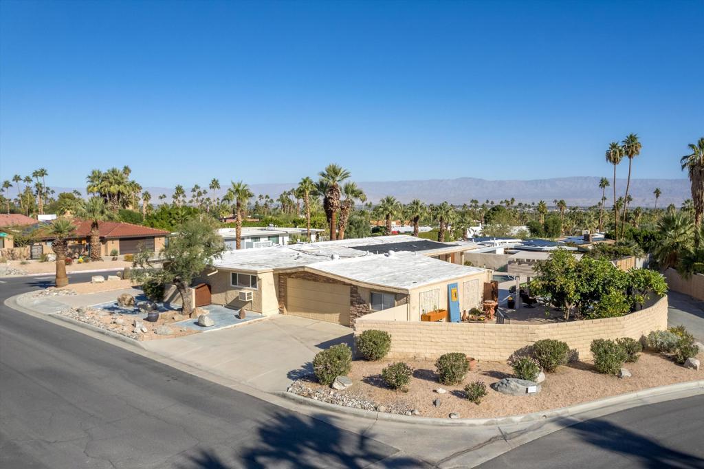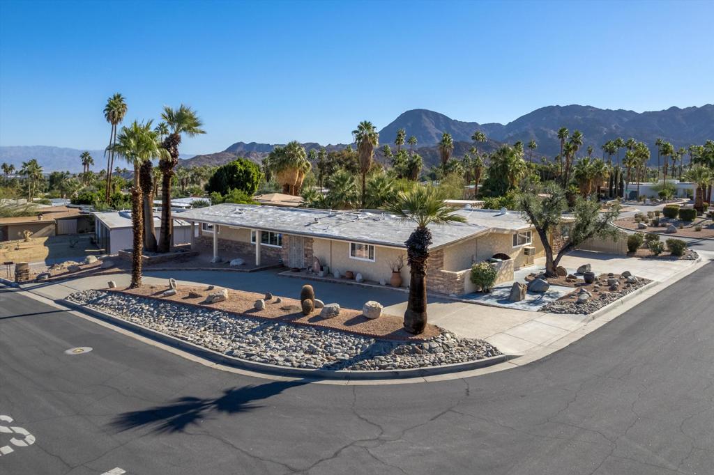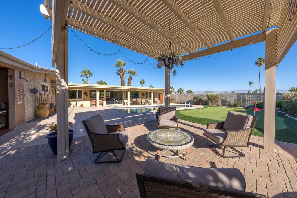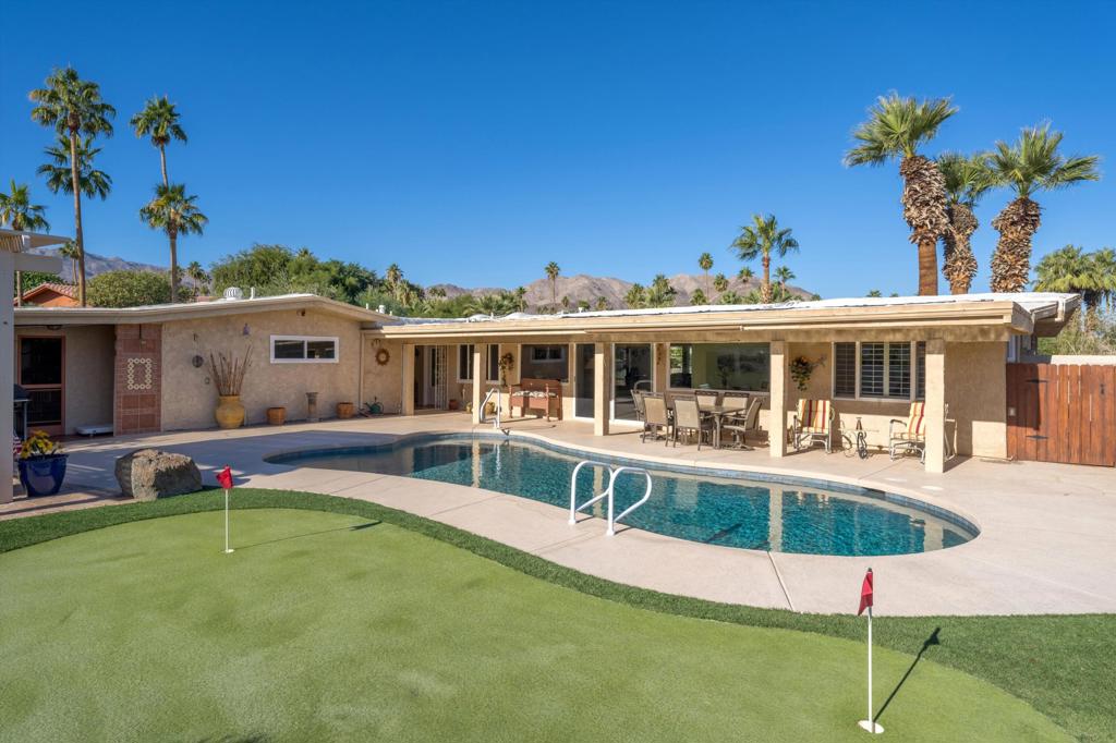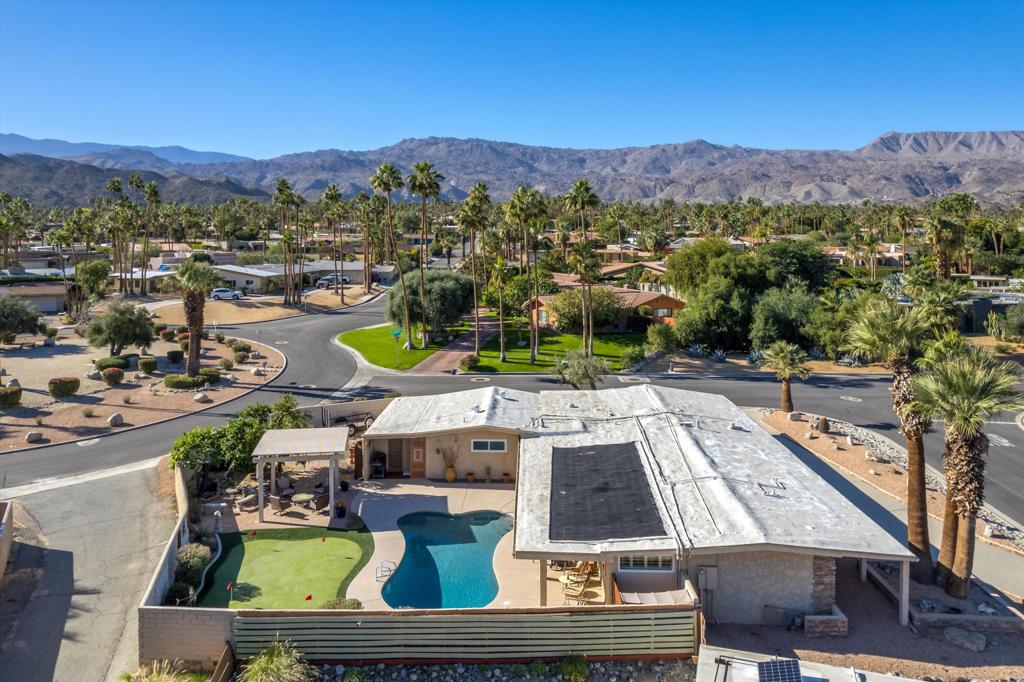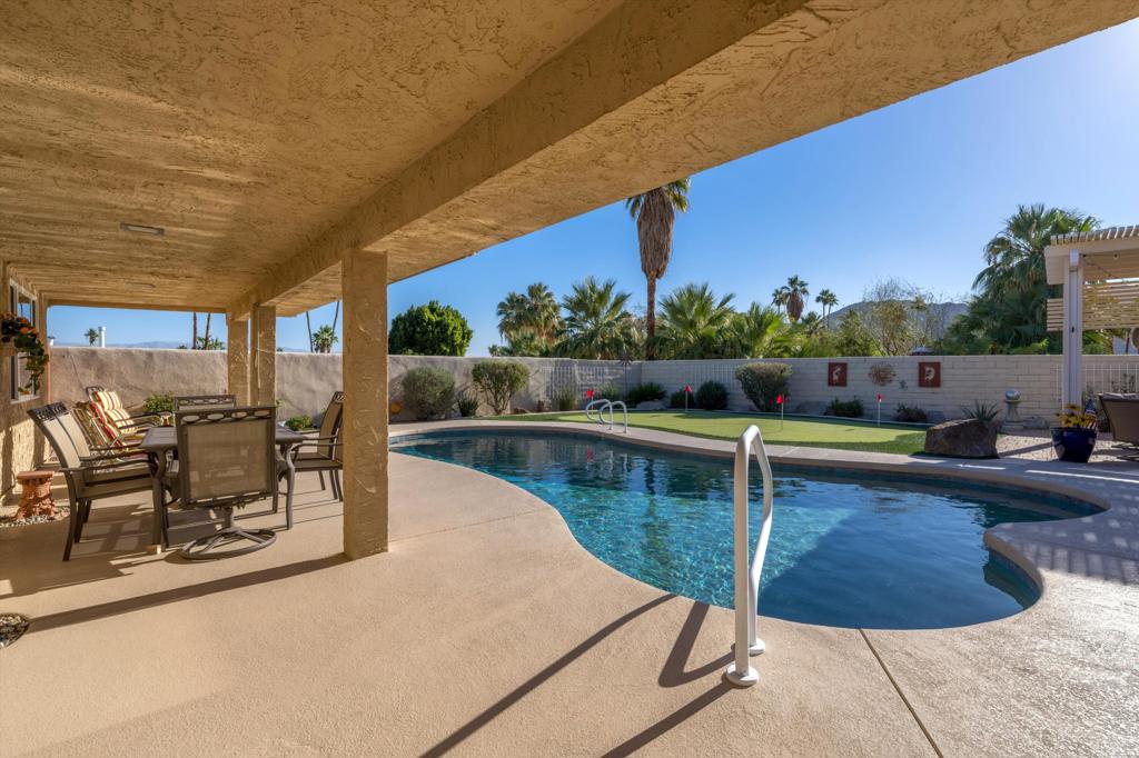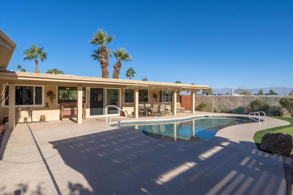 Presenting an exclusive opportunity in the highly coveted Silver Spur Ranch Community of South Palm Desert, renowned for its mid-century history. Situated on a generous corner lot, this property guarantees breathtaking 360-degree panoramic mountain views from the pinnacle of Sun Corral Trail. The outdoor haven features an expansive patio, solar heated saltwater pool, a putting green, and an outdoor shower. Ample space allows for basking in the desert sun or indulging in stargazing beneath the night sky by the gas-fired Chiminea. Indoors, you'll find two spacious bedrooms, two bathrooms, and a two-car garage with a separate workshop. An additional room currently exists as a craft/sewing room but can easily be converted to a large home office or a third bedroom. This home is beautiful as-is and has endless possibilities for additional indoor space. A short distance away lies El Paseo, Palm Desert's gem, offering exquisite shopping and dining experiences. The residence is also conveniently close to the popular Living Desert, Ironwood Park, and numerous hiking trails for exploration. Seller has partial ownership of a second alley easement/parcel and is currently exploring a Lot Line Adjustment. Unbelievably LOW HOA's make this the perfect desert retreat! The home will not last, so make an appointment to see it today - easy to show.