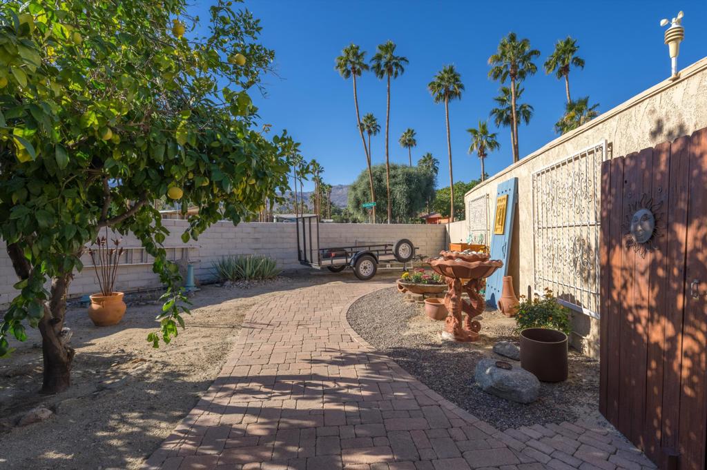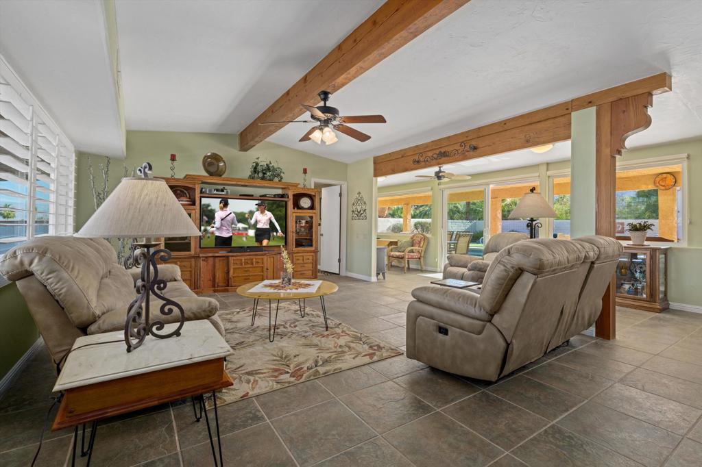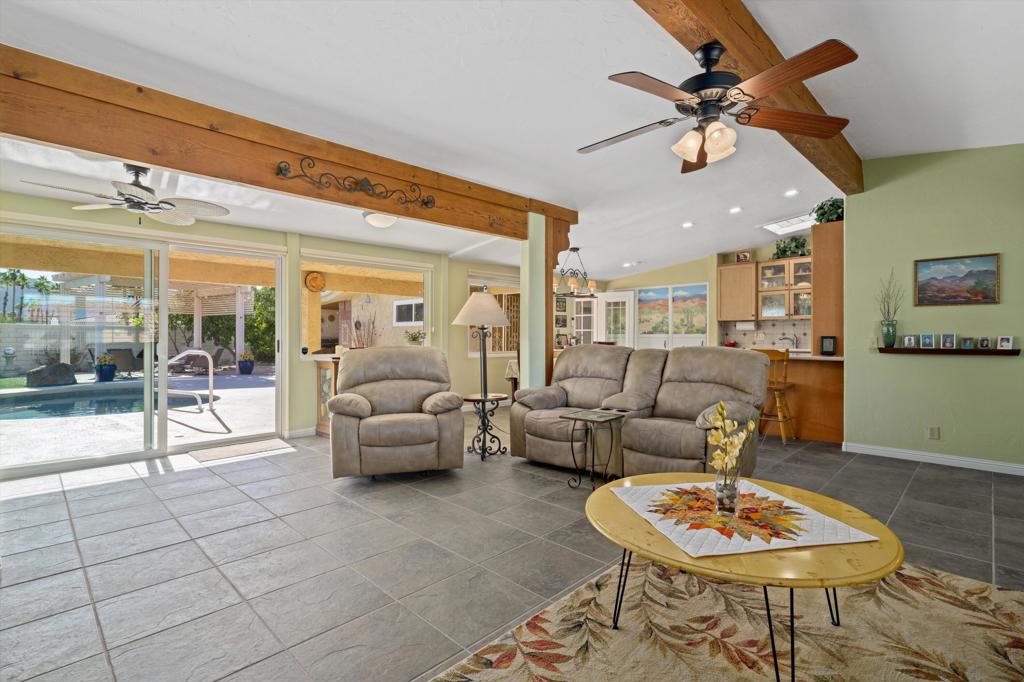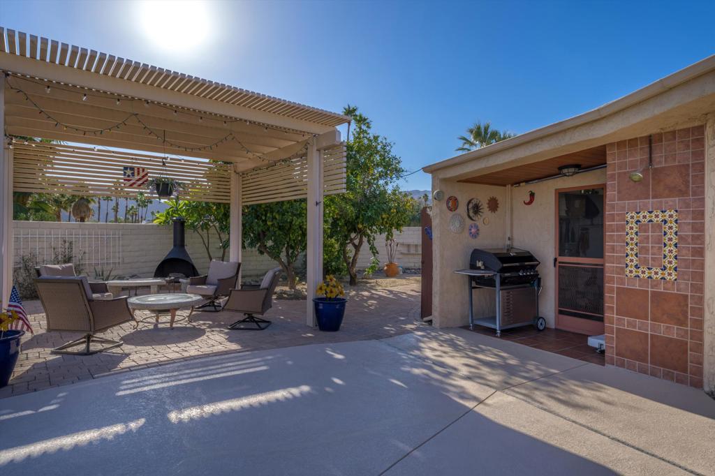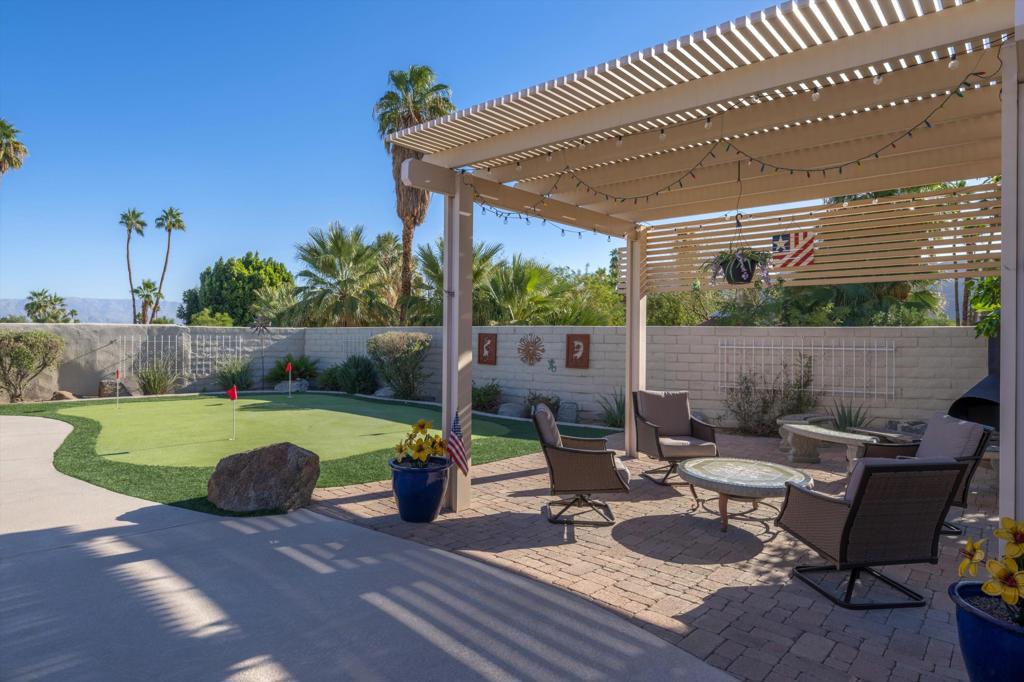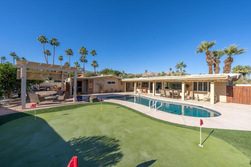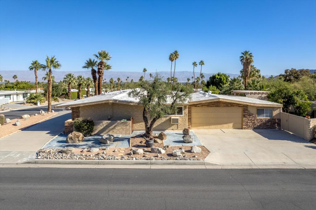 Presenting an exclusive opportunity in the highly coveted Silver Spur Ranch Community of South Palm Desert, renowned for its mid-century history. Situated on a generous corner lot, this property guarantees breathtaking 360-degree panoramic mountain views from the pinnacle of Sun Corral Trail. The outdoor haven features an expansive patio, solar heated saltwater pool, a putting green, and an outdoor shower. Ample space allows for basking in the desert sun or indulging in stargazing beneath the night sky by the gas-fired Chiminea. Indoors, you'll find two spacious bedrooms, two bathrooms, and a two-car garage with a separate workshop. An additional room currently exists as a craft/sewing room but can easily be converted to a large home office or a third bedroom. This home is beautiful as-is and has endless possibilities for additional indoor space. A short distance away lies El Paseo, Palm Desert's gem, offering exquisite shopping and dining experiences. The residence is also conveniently close to the popular Living Desert, Ironwood Park, and numerous hiking trails for exploration. Seller has partial ownership of a second alley easement/parcel and is currently exploring a Lot Line Adjustment. Unbelievably LOW HOA's make this the perfect desert retreat! The home will not last, so make an appointment to see it today - easy to show.