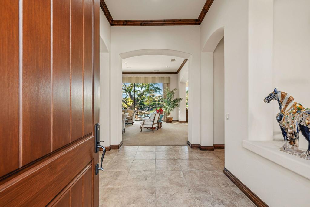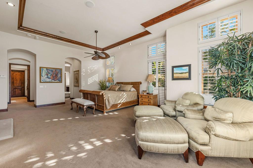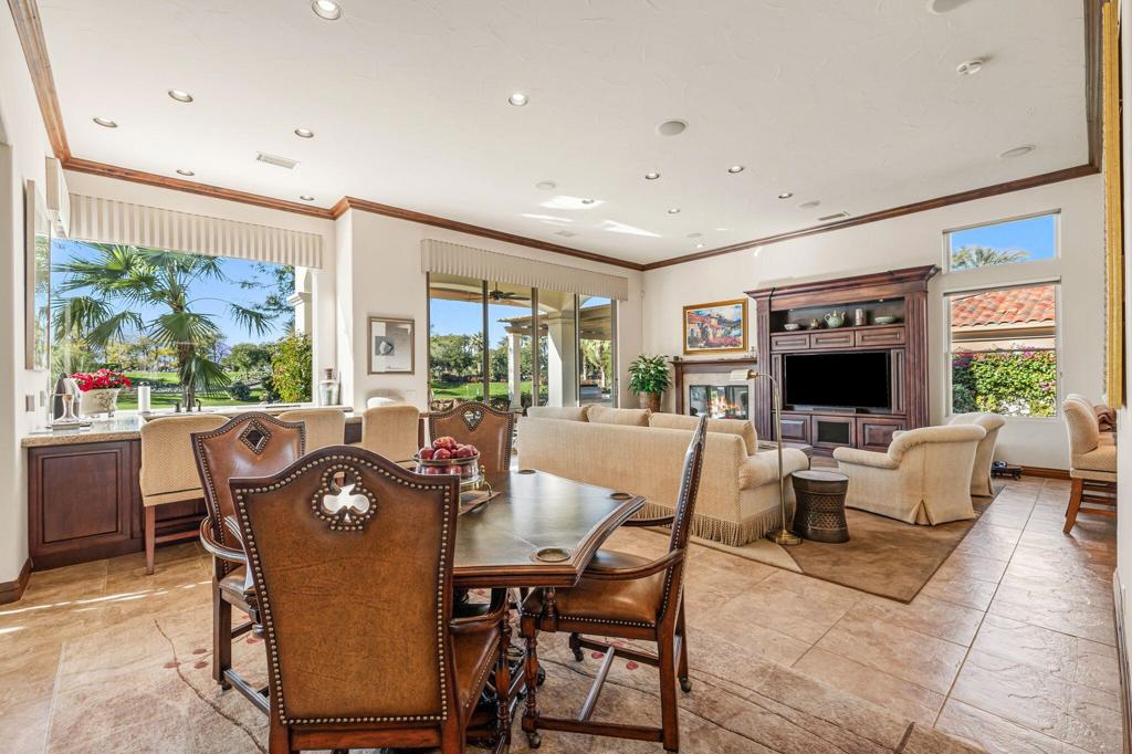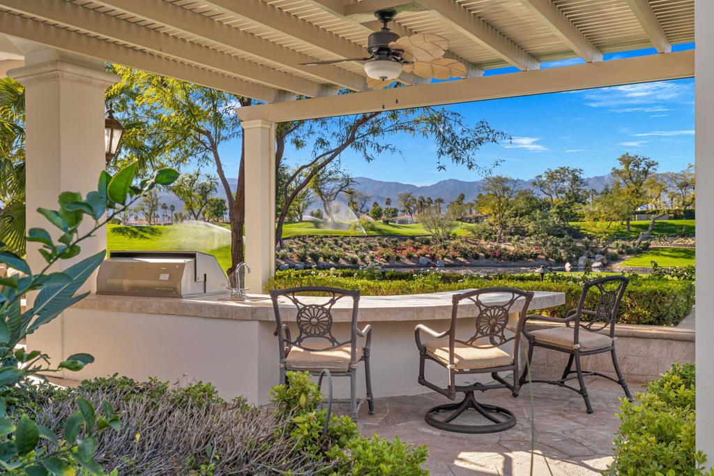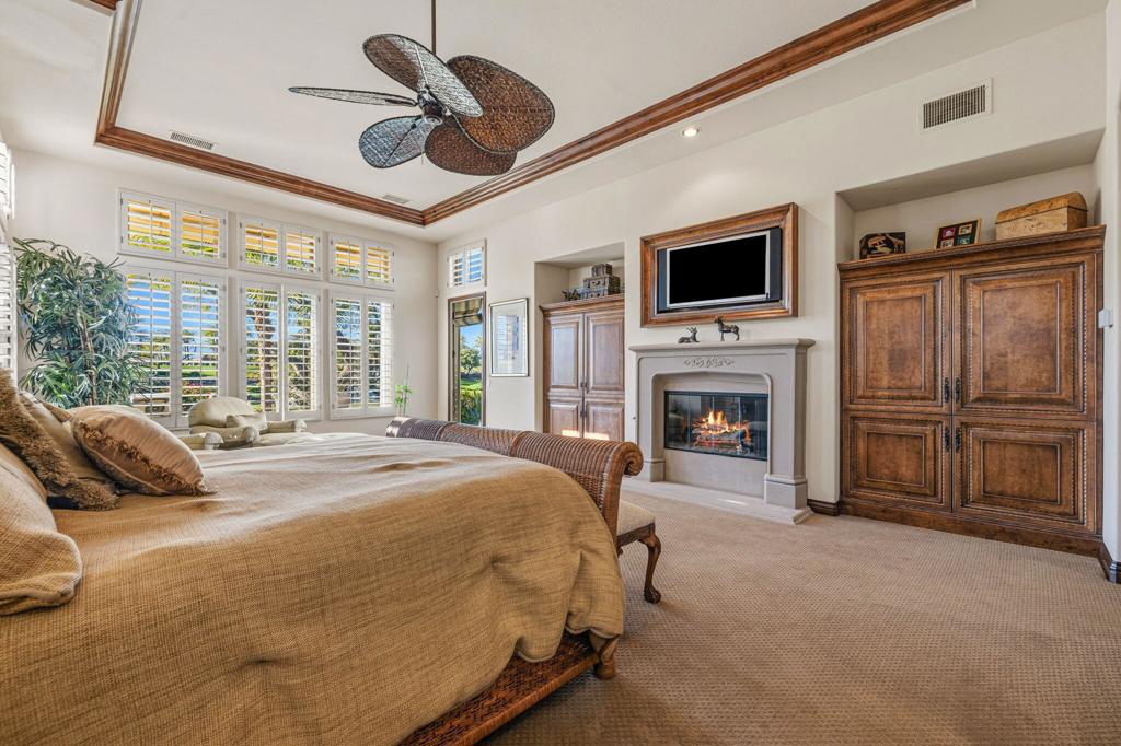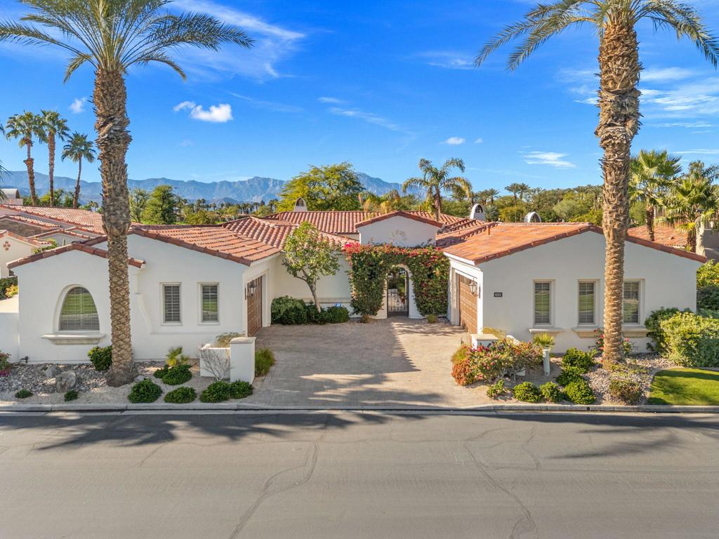 A truly rare opportunity to own the iconic Toscana Cortona 923 Prototype in prestigious Indian Ridge Country Club! This one-of-a-kind estate showcases timeless elegance, exceptional craftsmanship, and breathtaking desert vistas, all set on an oversize premium lot with views of the iconic waterfalls overlooking the 18th fairway of the Arroyo Course. Valley wide renowned builder, Bill Bone and Sunrise Corporation, saved the best lot for last to build this spectacular masterpiece within close walking distance to clubhouse, fitness, tennis & pickleball, spa and restaurants. Designed for both grand entertaining and everyday luxury, the residence features a spacious open floor plan with 4 bedrooms, 4.5 baths, including a two-room detached casita, ideal for hosting guests in comfort and privacy. Formal living and dining rooms flow seamlessly into a generous family room with wet bar and fireplace, opening to the gourmet kitchen appointed with granite countertops, a Wolf range, Sub-Zero refrigerator, large center island, walk-in pantry, and charming breakfast nook. The magnificent primary suite offers views of the golf course and mountains, dual independent bathrooms and walk-in closets, a gas fireplace, sitting area, spa-inspired soaking tub, and oversized double shower offering a true private retreat. Custom, high-quality finishes are found throughout, including built-in cabinetry, tile flooring, crown molding, shutters, remote-controlled blinds, and thoughtfully designed outdoor spaces. The resort-style backyard is the showpiece featuring a pebble-tech infinity pool and spa, paver patios, fountain, and built-in BBQ island--perfectly positioned to capture sweeping golf course, lake, waterfall, and majestic San Jacinto Mountain views. Offered decorated and designer furnished per inventory, this exceptional Toscana estate with 4-car garage delivers privacy, prestige, and unparalleled beauty--a dream home that must be experienced to be fully appreciated. The Golf Membership available with no waitlist is the cherry on top.