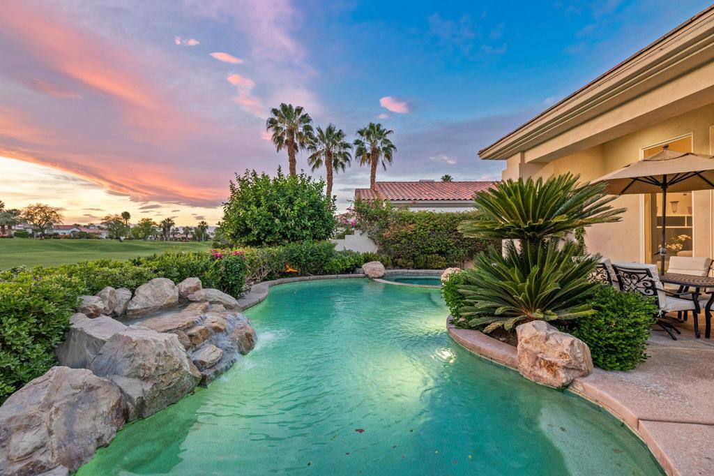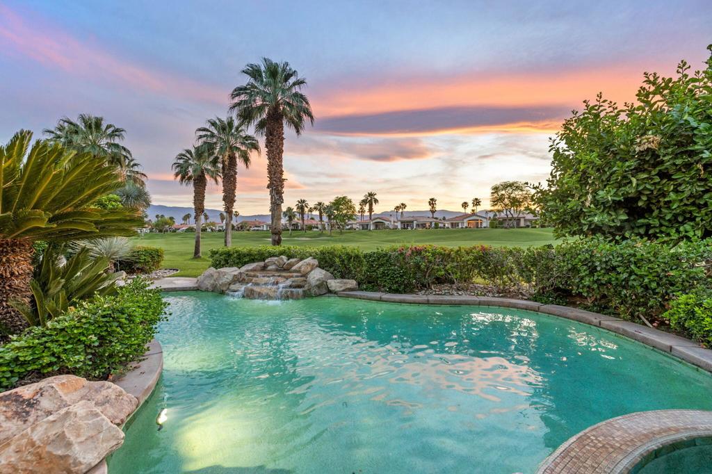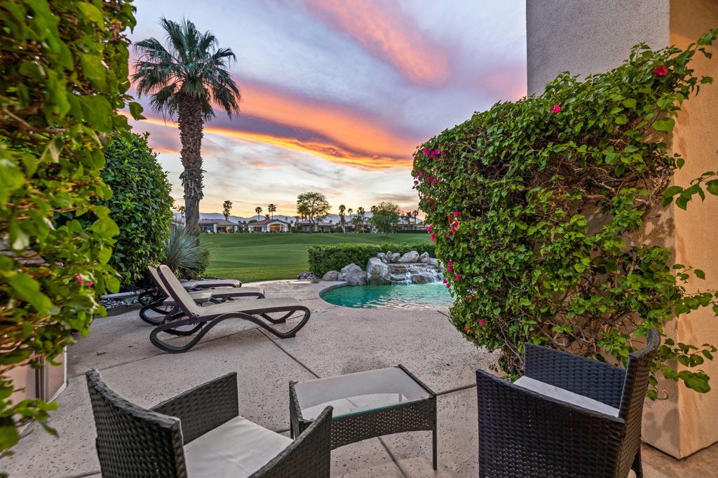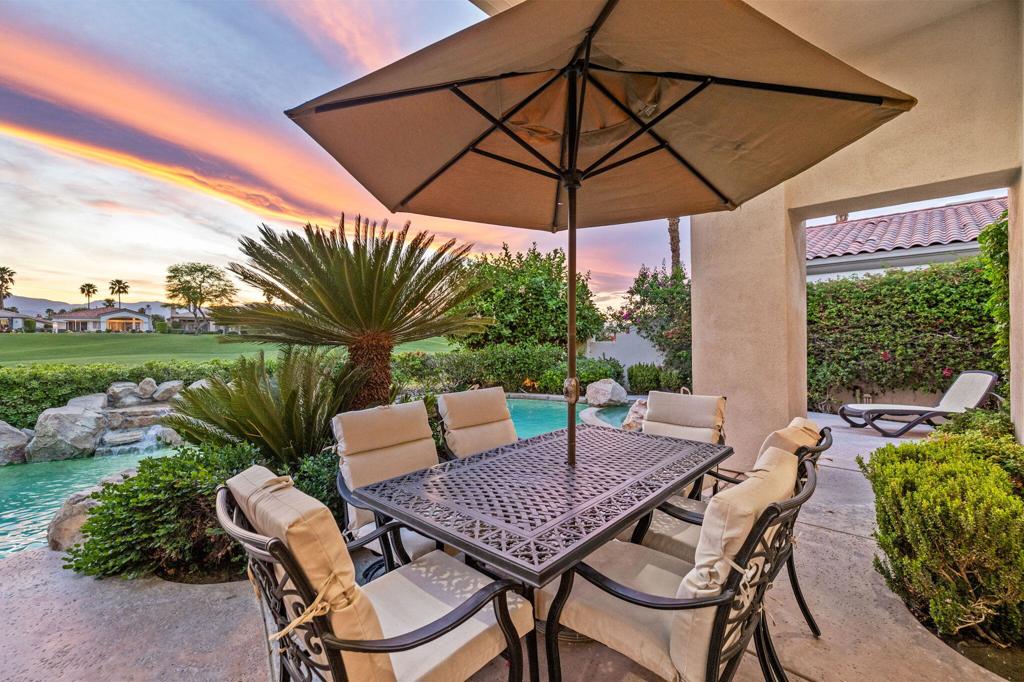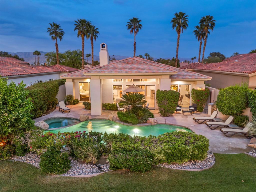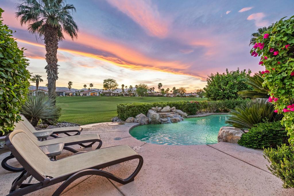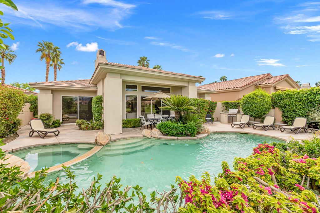 Welcome to one of the most desirable opportunities in Indian Ridge. This highly sought-after west-facing Bougainvillea 1 floor plan is perfectly positioned on the 14th fairway of the Arroyo Course, capturing breathtaking sunsets and delivering the ultimate desert lifestyle. Designed for effortless indoor-outdoor living, this home offers your own private retreat, complete with a heated pool and spa with multi-color lighting, built-in BBQ, and even a Tesla charger. Whether you're entertaining or unwinding under the stars, every detail has been thoughtfully curated. Spanning 2,430 square feet, the home features three spacious en-suite bedrooms and 3.5 baths, offering ideal privacy with separated guest suites. The generous primary suite opens directly to the spa, perfect for a quiet evening soak after a day on the course. Offered furnished and move-in ready, the home has been freshly painted throughout including cabinetry, and features granite countertops in both the kitchen and bar area. Lush citrus trees add charm and character to your outdoor space. And for those looking at investment potential, this property comes with a built-in returning tenant, generating approximately $40,000 annually. This is more than a home, it's a lifestyle, an income opportunity, and a place to truly enjoy everything desert living has to offer.