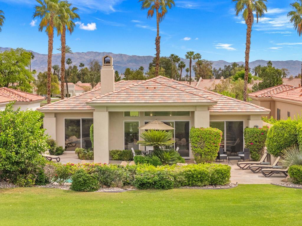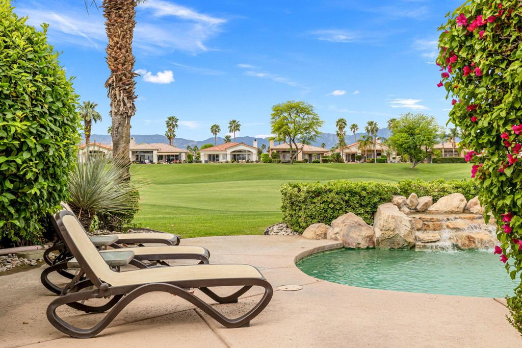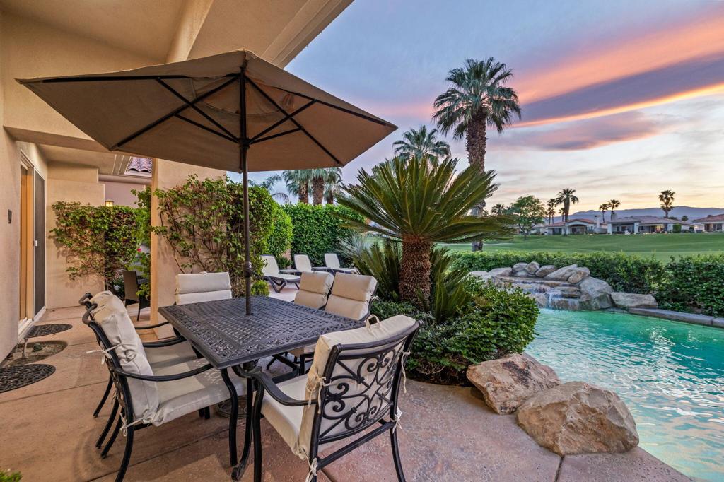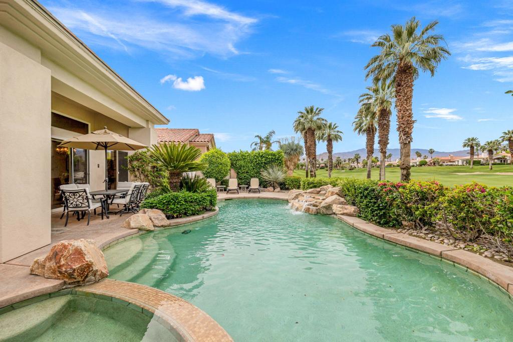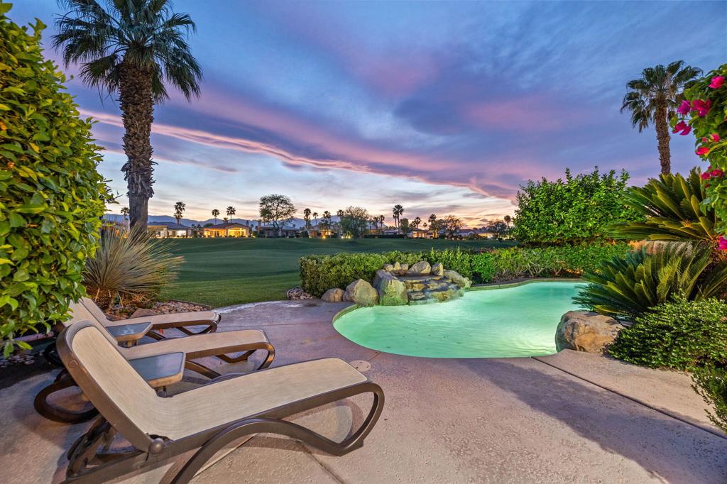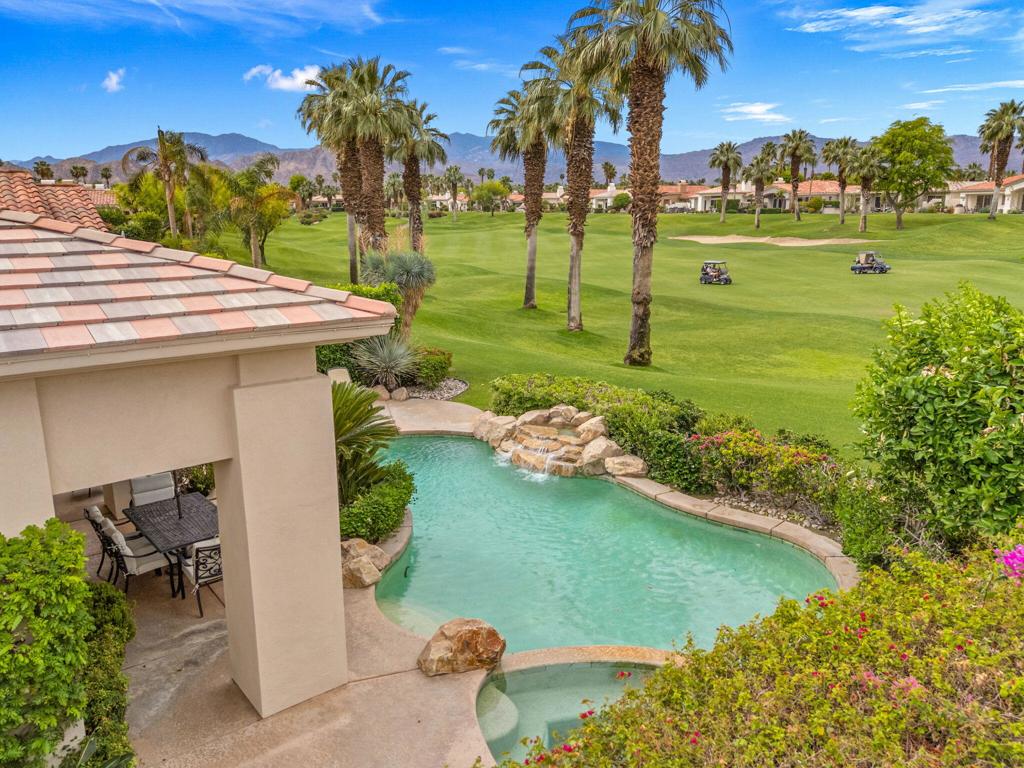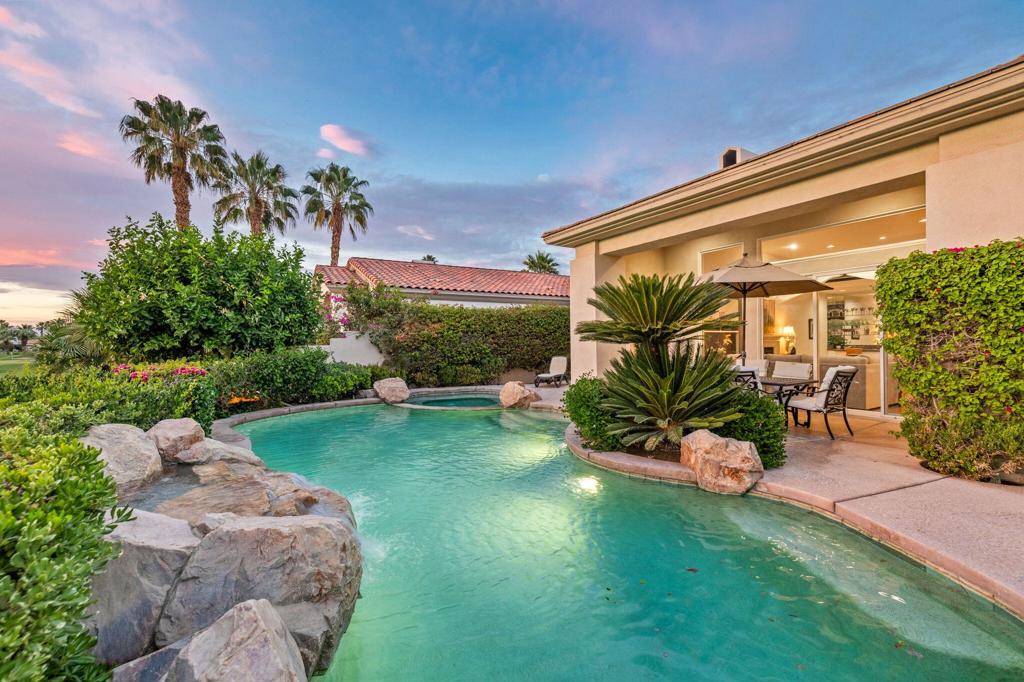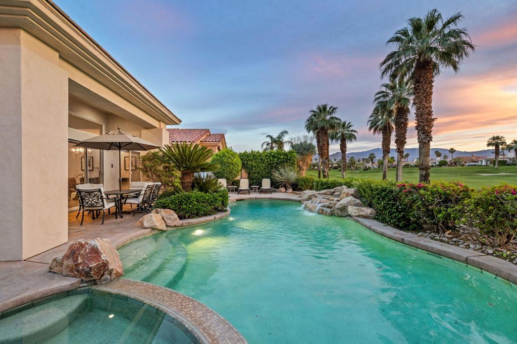 Welcome to one of the most desirable opportunities in Indian Ridge. This highly sought-after west-facing Bougainvillea 1 floor plan is perfectly positioned on the 14th fairway of the Arroyo Course, capturing breathtaking sunsets and delivering the ultimate desert lifestyle. Designed for effortless indoor-outdoor living, this home offers your own private retreat, complete with a heated pool and spa with multi-color lighting, built-in BBQ, and even a Tesla charger. Whether you're entertaining or unwinding under the stars, every detail has been thoughtfully curated. Spanning 2,430 square feet, the home features three spacious en-suite bedrooms and 3.5 baths, offering ideal privacy with separated guest suites. The generous primary suite opens directly to the spa, perfect for a quiet evening soak after a day on the course. Offered furnished and move-in ready, the home has been freshly painted throughout including cabinetry, and features granite countertops in both the kitchen and bar area. Lush citrus trees add charm and character to your outdoor space. And for those looking at investment potential, this property comes with a built-in returning tenant, generating approximately $40,000 annually. This is more than a home, it's a lifestyle, an income opportunity, and a place to truly enjoy everything desert living has to offer.