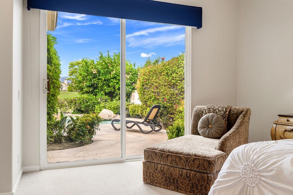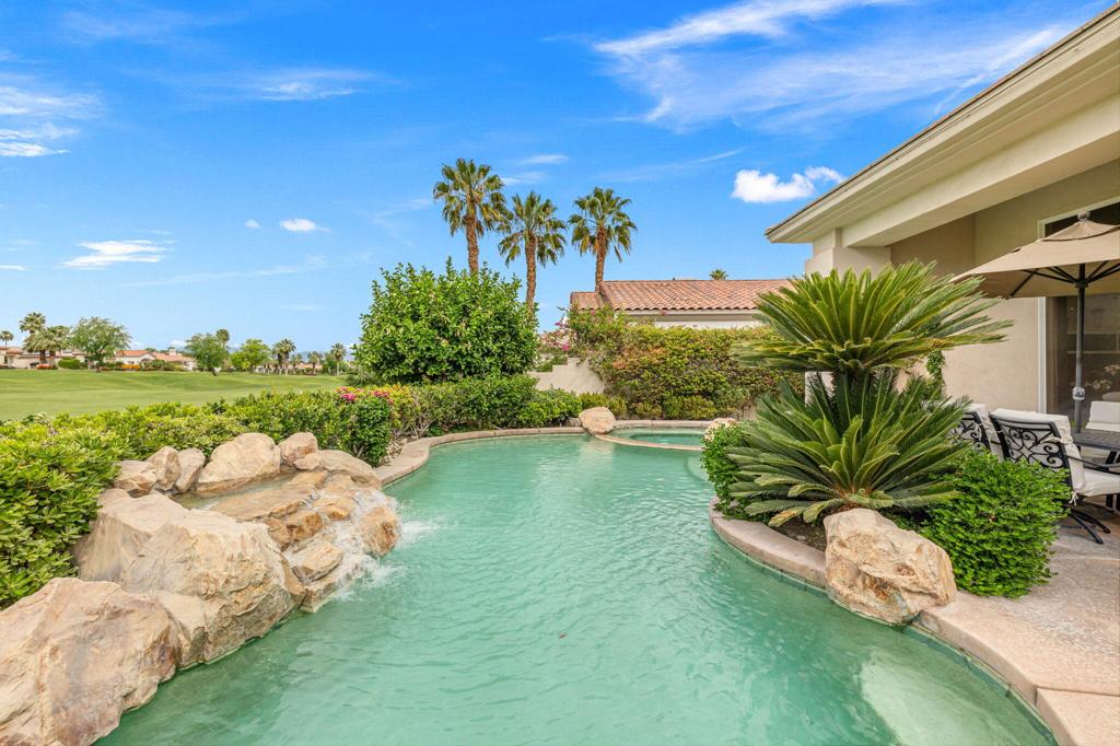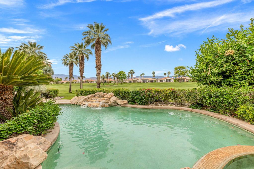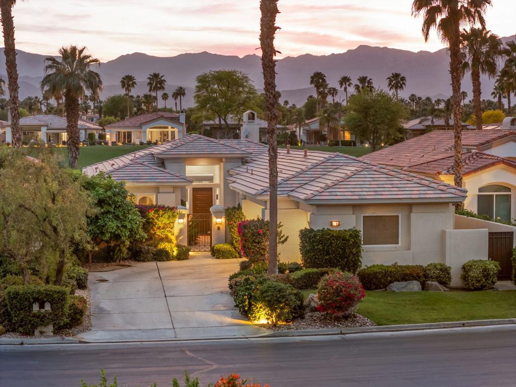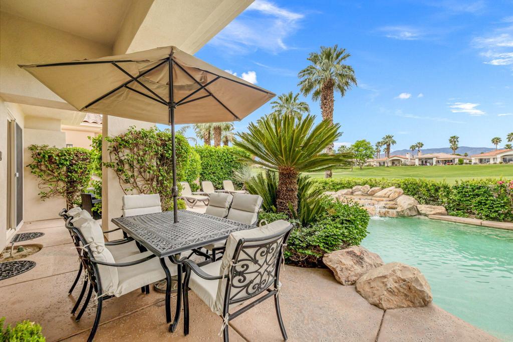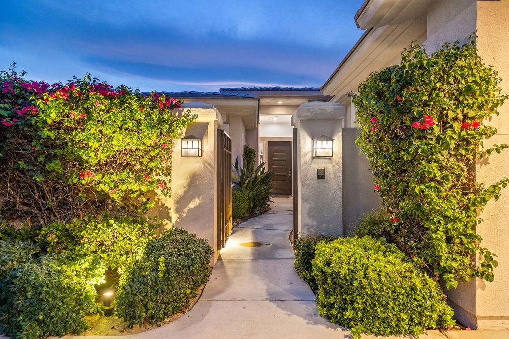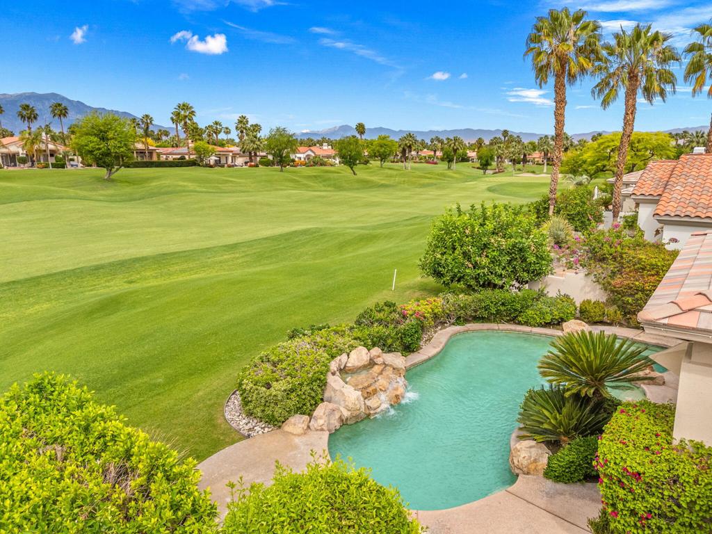 Welcome to one of the most desirable opportunities in Indian Ridge. This highly sought-after west-facing Bougainvillea 1 floor plan is perfectly positioned on the 14th fairway of the Arroyo Course, capturing breathtaking sunsets and delivering the ultimate desert lifestyle. Designed for effortless indoor-outdoor living, this home offers your own private retreat, complete with a heated pool and spa with multi-color lighting, built-in BBQ, and even a Tesla charger. Whether you're entertaining or unwinding under the stars, every detail has been thoughtfully curated. Spanning 2,430 square feet, the home features three spacious en-suite bedrooms and 3.5 baths, offering ideal privacy with separated guest suites. The generous primary suite opens directly to the spa, perfect for a quiet evening soak after a day on the course. Offered furnished and move-in ready, the home has been freshly painted throughout including cabinetry, and features granite countertops in both the kitchen and bar area. Lush citrus trees add charm and character to your outdoor space. And for those looking at investment potential, this property comes with a built-in returning tenant, generating approximately $40,000 annually. This is more than a home, it's a lifestyle, an income opportunity, and a place to truly enjoy everything desert living has to offer.