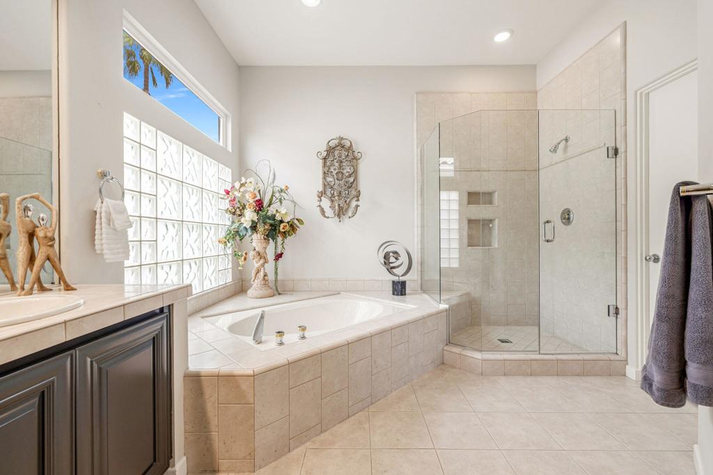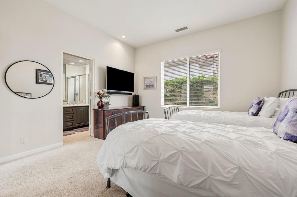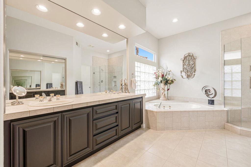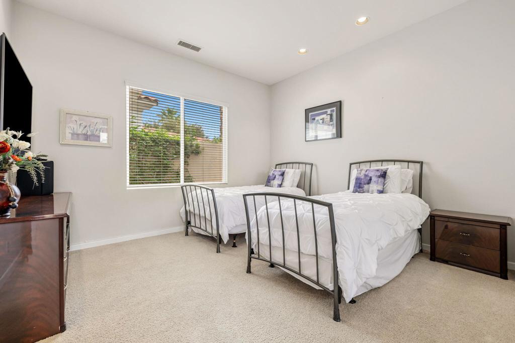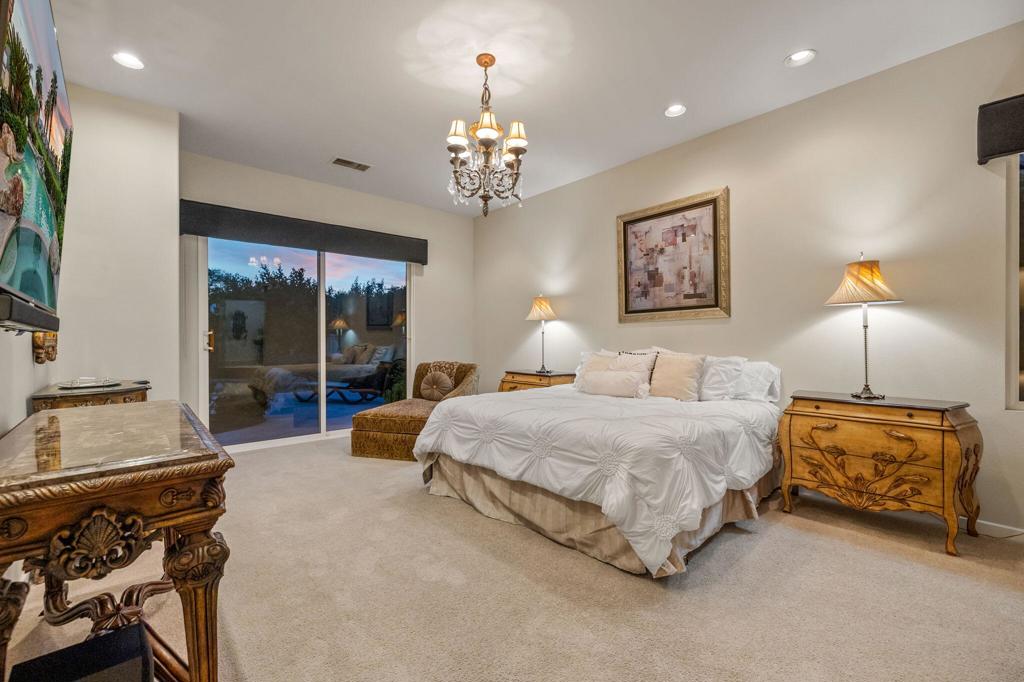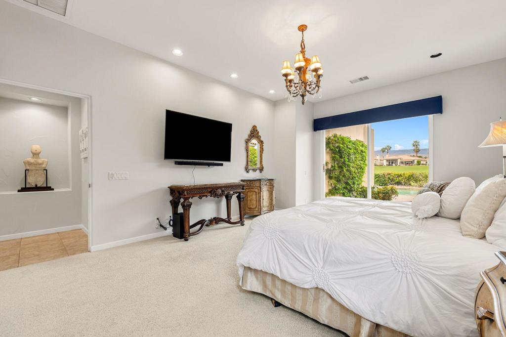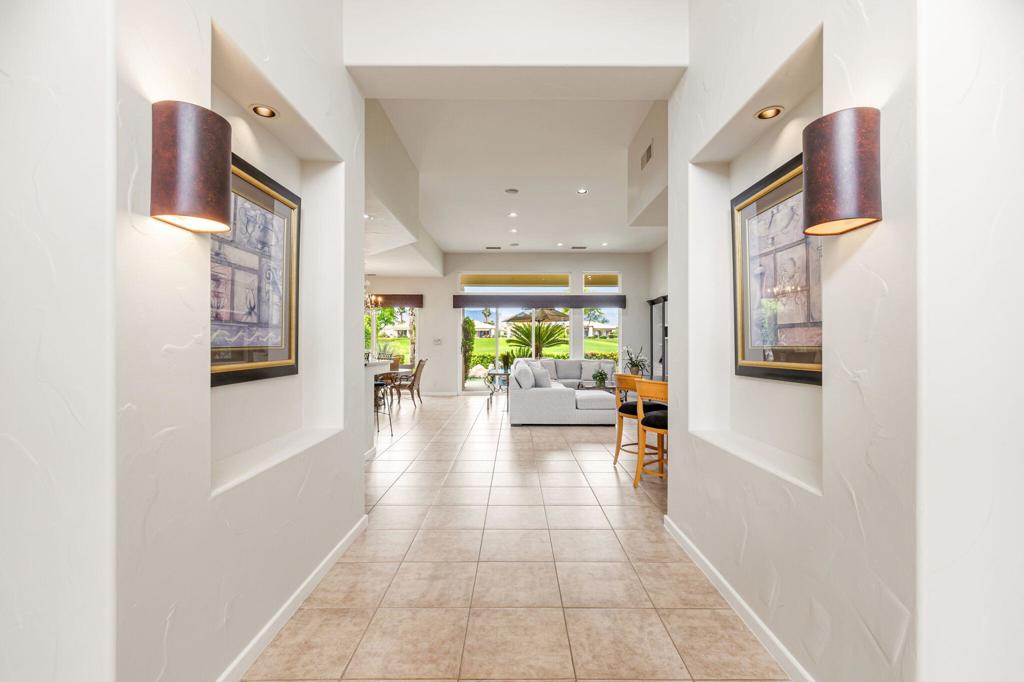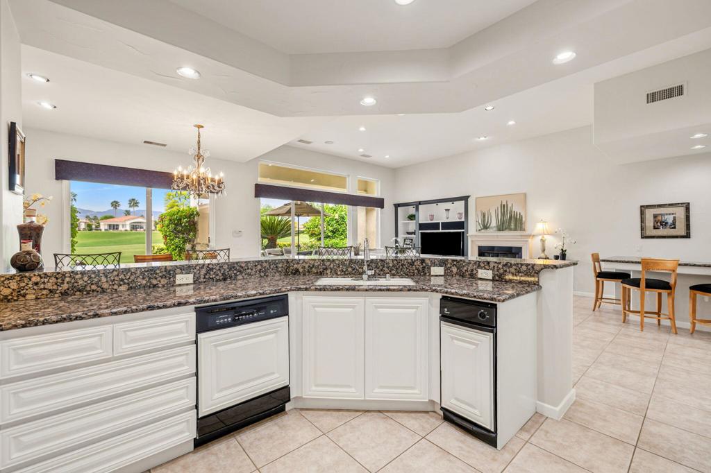 Welcome to one of the most desirable opportunities in Indian Ridge. This highly sought-after west-facing Bougainvillea 1 floor plan is perfectly positioned on the 14th fairway of the Arroyo Course, capturing breathtaking sunsets and delivering the ultimate desert lifestyle. Designed for effortless indoor-outdoor living, this home offers your own private retreat, complete with a heated pool and spa with multi-color lighting, built-in BBQ, and even a Tesla charger. Whether you're entertaining or unwinding under the stars, every detail has been thoughtfully curated. Spanning 2,430 square feet, the home features three spacious en-suite bedrooms and 3.5 baths, offering ideal privacy with separated guest suites. The generous primary suite opens directly to the spa, perfect for a quiet evening soak after a day on the course. Offered furnished and move-in ready, the home has been freshly painted throughout including cabinetry, and features granite countertops in both the kitchen and bar area. Lush citrus trees add charm and character to your outdoor space. And for those looking at investment potential, this property comes with a built-in returning tenant, generating approximately $40,000 annually. This is more than a home, it's a lifestyle, an income opportunity, and a place to truly enjoy everything desert living has to offer.