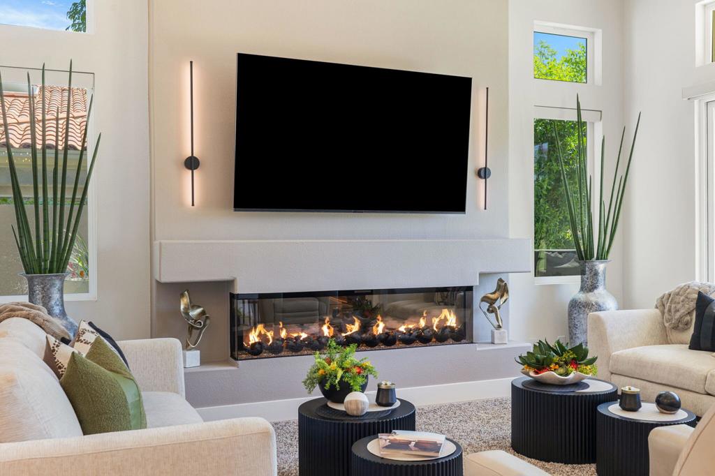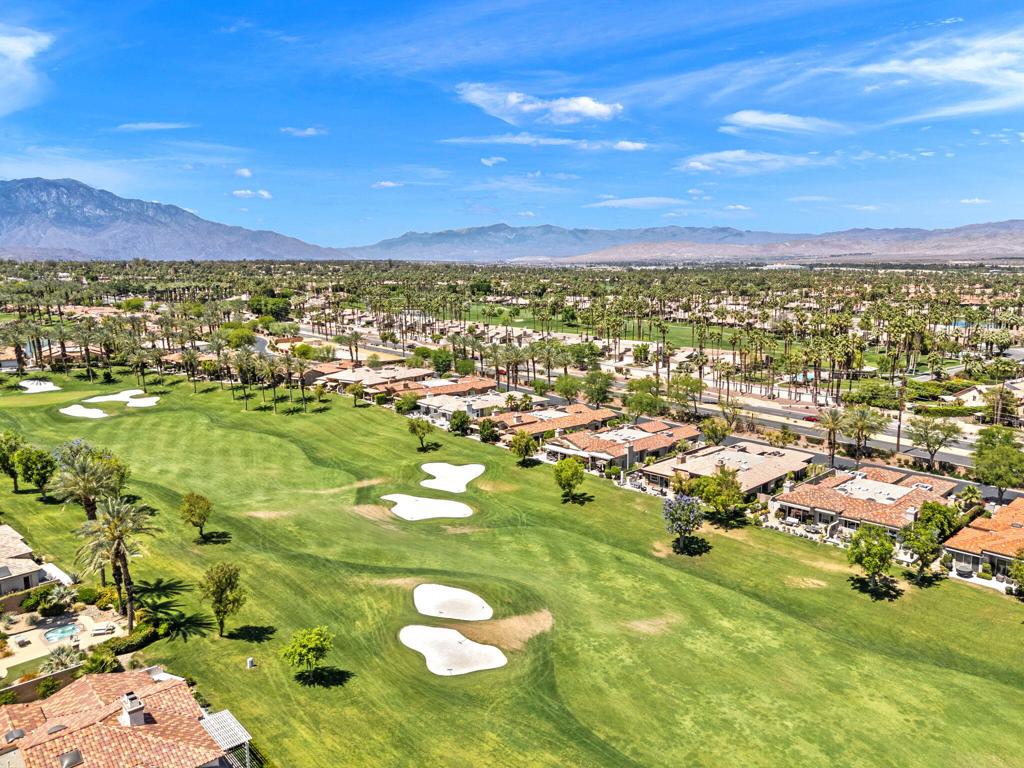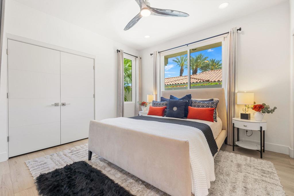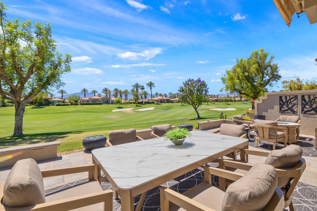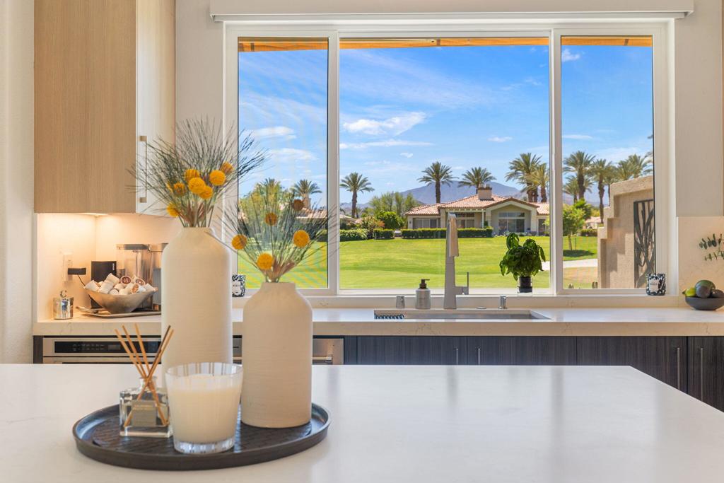 Reimagined and completely remodeled from top to bottom, this stunning Acacia 3 floor plan has been transformed into a sophisticated modern desert retreat. Walls have been removed to create an open, light-filled layout, and an additional powder bath has been thoughtfully added for enhanced functionality and effortless entertaining. From the moment you arrive, you'll appreciate the upgraded paver driveway, courtyard, and back patio, along with beautifully redesigned courtyard landscaping that sets the tone for seamless indoor-outdoor living. A custom front door makes a striking first impression and welcomes you into the home. Inside, luxury vinyl flooring flows throughout, complementing the reimagined kitchen featuring brand-new custom cabinetry, quartz countertops, and a full suite of new appliances, including a built-in Bosch espresso machine. The living room showcases a sleek electric fireplace and opens effortlessly to the outdoor spaces, perfectly positioned to capture desirable south-facing mountain views, and overlooks the 7th hole of The Grove course. The primary suite is a true showpiece, offering a spa-inspired bathroom with all-new cabinetry, quartz countertops, updated sinks and fixtures, a walk-in shower, and a bonus custom-designed closet. Two well-appointed guest bedrooms share a beautifully updated bath, providing comfortable and stylish accommodations for family and guests. Throughout the home, modern ceiling fans, designer sconces, and LED lighting create a warm yet contemporary ambiance. Even the laundry room has been thoughtfully designed with stylish finishes and functional upgrades that elevate everyday living. A newer air conditioning system adds year-round comfort and efficiency as well as all brand-new windows and sliders throughout the home. This is a rare opportunity to own a fully reimagined Acacia 3, offering high-end finishes, modern design, and exceptional attention to detail in one of Indian Ridge's most desirable settings. Home is being offered furnished per inventory. Club membership available or golf membership available per the waitlist.