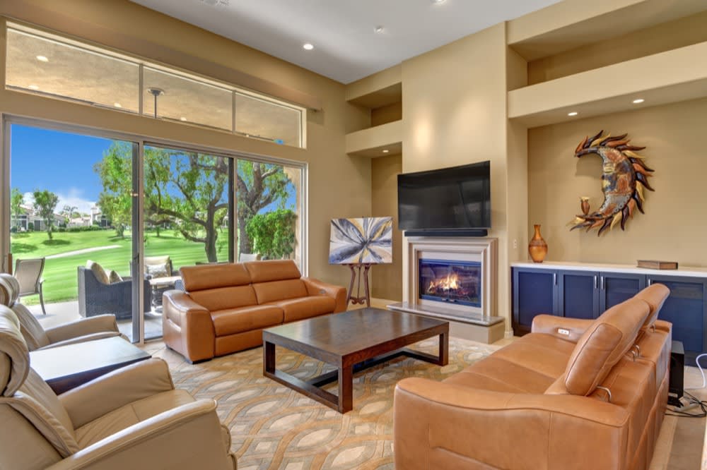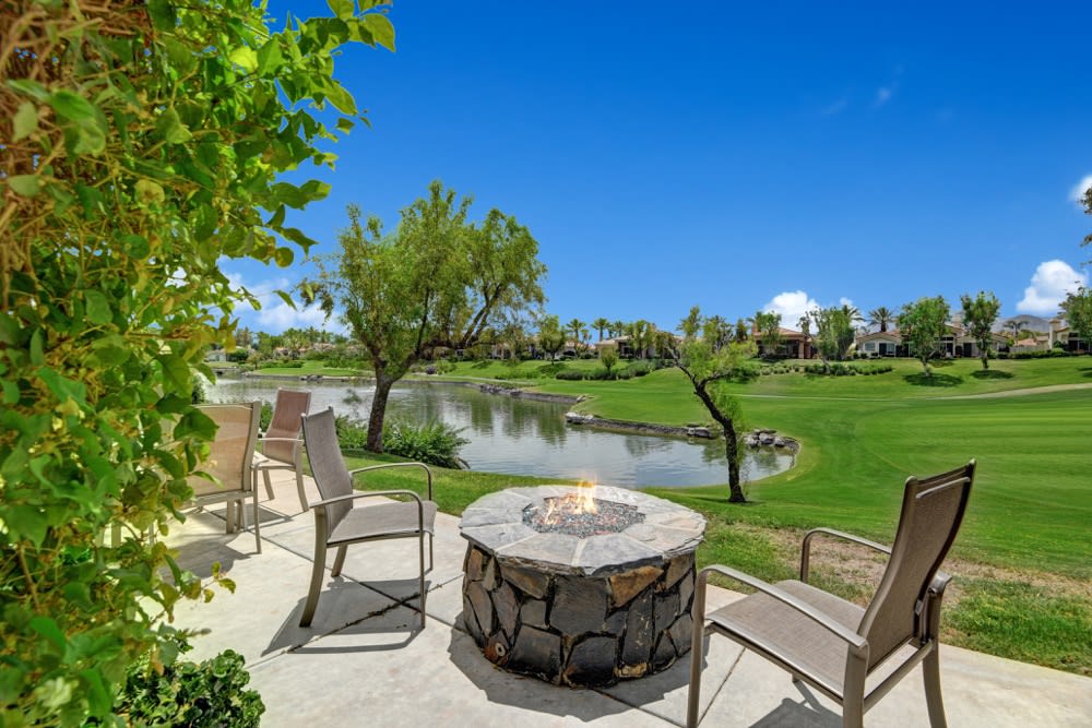 Rare south facing Acacia 5 condo in the beautiful Indian Ridge Country Club! Enjoy the amazing southern mountain and water views while sitting on your private patio over looking the 7th hole of the Grove course. Whether you are using your custom built-in barbecue or simply sitting by the fire pit, either experience is a perfect setting for the desert evenings. This home has been remodeled, partial wall removed between kitchen and living room creating a more expansive great room feel. Painted cabinets throughout the home, new lighting, stainless steel appliances, remote solar shades and a breakfast bar in the kitchen are more of the many features included. All bedrooms have new carpet and shutter window coverings as well as private en suite bathrooms. New skylights help show off how light and bright the home is as well as the modern designer furnishings. Offered furnished per inventory list. Club or Golf Membership available.
