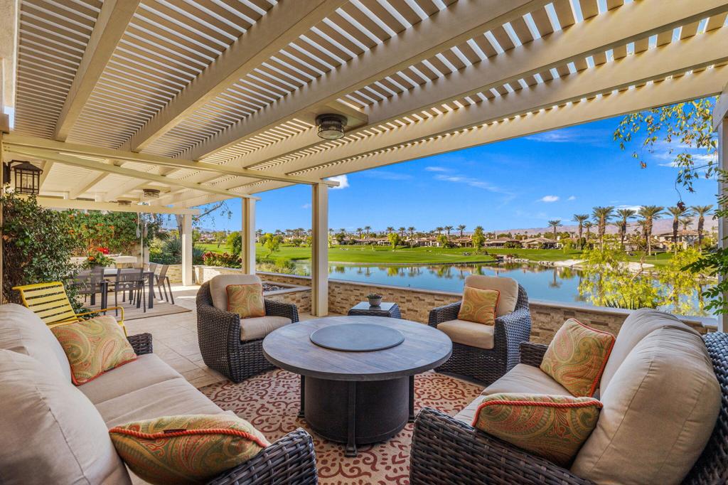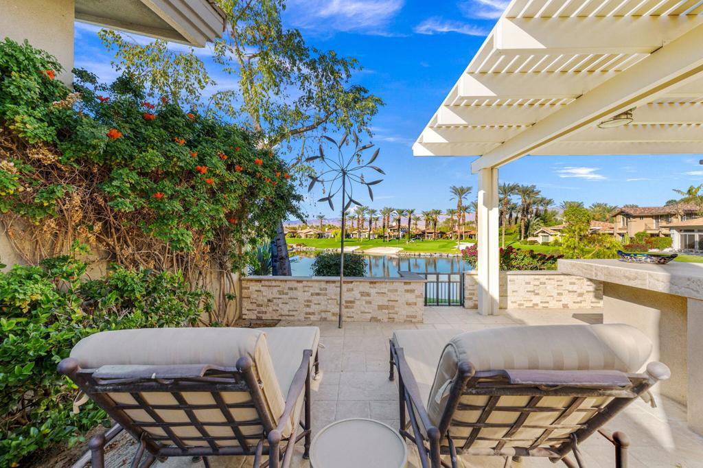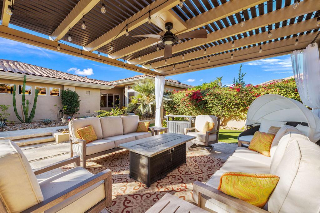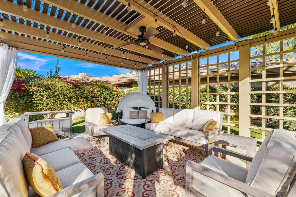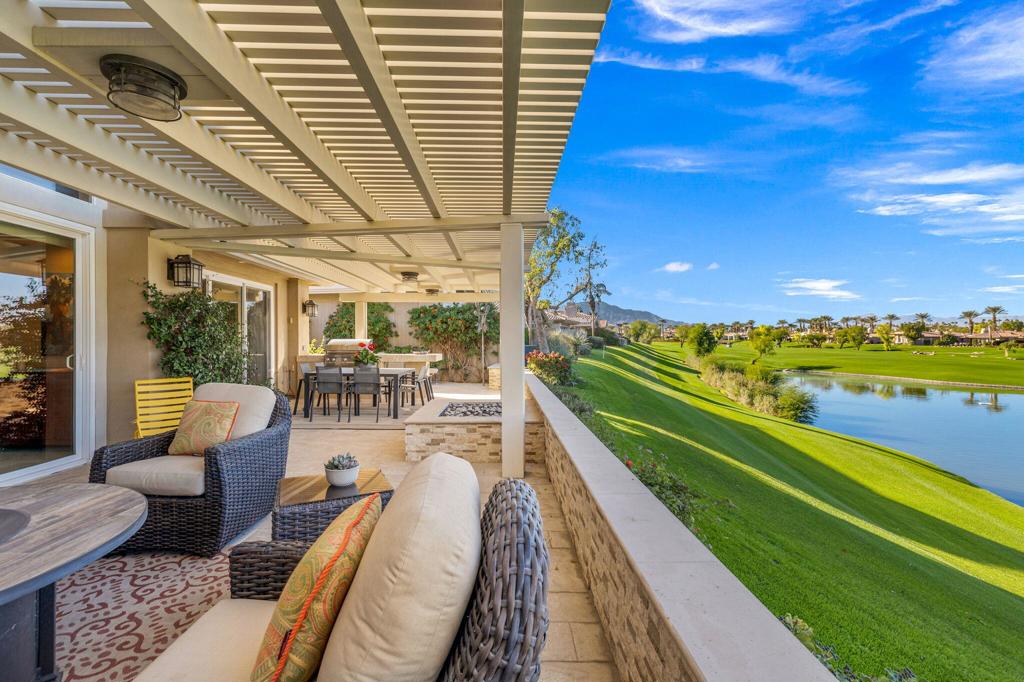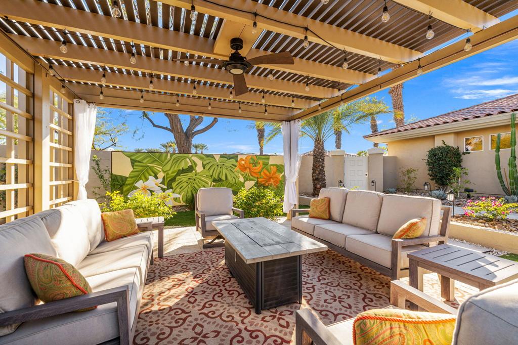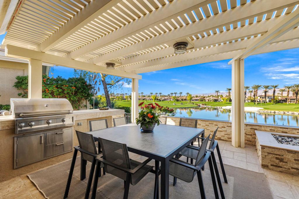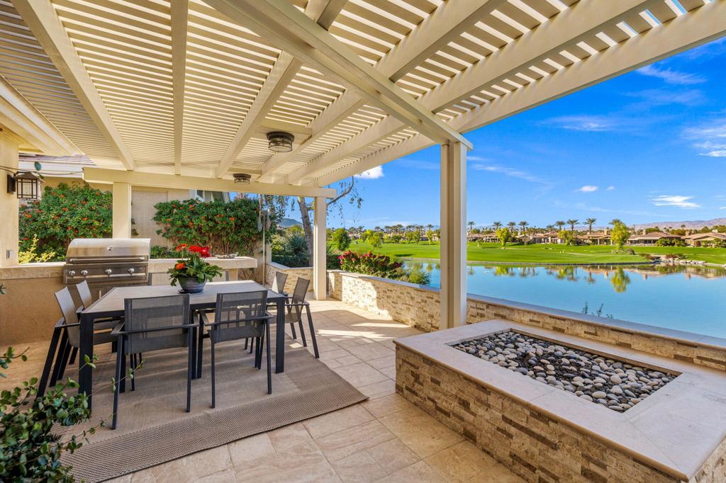 Step Into Your Dream Home at Indian Ridge! Prepare to be wowed by this stunning 3-bedroom, 3.5-bathroom Smoke Tree 3 floor plan, offering an expansive 3,102 square feet of luxurious living space. Perfectly perched on the 6th hole of the Grove course, this home is a true triple threat: breathtaking mountain and water views, exceptional amenities, and unrivaled charm. Outdoors, you'll find not one but two entertainment spaces: a back patio complete with a built-in BBQ, cozy fire pit, stylish stacked stone pony wall, and sleek slatted patio cover to accommodate patio lighting. The oversized courtyard is equally inviting, featuring a built-in pergola, ideal for soaking up the sun, sipping your favorite drink, or diving into a good book. If you've had dreams of a south facing pool, there is plenty of room to add a front-loaded pool. Step inside to discover a home that has been meticulously maintained, exuding pride of ownership at every turn. The light and bright kitchen sets the stage for culinary delights, while the remodeled primary bathroom invites you to unwind in a luxurious soaking tub, the perfect end to a day filled with the endless activities Indian Ridge has to offer. Bonus? This gem includes a club membership with no waitlist. Don't let this exceptional property pass you by. Call today for your private showing and make this beauty yours!